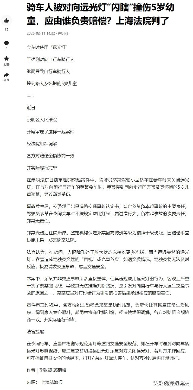 上海,男子正在骑自行车,对面突然开过来一辆开着远光灯的车,男子瞬间被闪瞎,自行车失控,正巧撞到路边抱小孩的女子,小孩当场飞了出去! 据光明网报道,事情发生在上海崇明区某路段。 案发当天晚上,蔡某加了会班,下班后已经没有公交了,蔡某干脆扫了一辆自行车,准备慢慢悠悠骑着回家,顺道吹吹风。 当时天色已经很晚了,路上已经很黑了,蔡蔡某靠着路边,慢慢悠悠的骑。 与此同时,5岁的小郑刚吃过晚饭,非要下楼玩,小郑的妈妈被他磨的没办法,只好带着他出去散步。 母子两个玩了一会,小郑撒娇说走不动了,非要让妈妈抱。小郑妈只好抱着他,一步一步沿着小路往家走。 母子两个一边说着话,一边走路,正在这时候,对面突然驶过来了一辆小轿车。 这辆小轿车开着远光灯,小郑和小郑妈被灯光刺得眼睛都睁不开,母子二人下意识闭了一下眼睛。 谁知道,就在这时候,身后突然传来一股大力,小郑妈突然被撞了一下,怀里的小郑猝不及防飞了出去。 瞬间小郑的哭声、陌生人的哎哟声,以及什么东西倒地的声音交汇在了一起。 一秒钟后,小轿车走远了,小郑妈终于看清了眼前的情况,撞倒他们母子的正是蔡某。 原来蔡某回家也是走这条路,原本他距离小郑和小郑妈的距离就不远,对面小轿车开着远光灯行驶过来,蔡某的双眼瞬间被闪瞎。 蔡某瞬间失去了视觉能力,还来不及捏刹车闸,就撞上了前方的小郑妈。 事发突然,小郑妈毫无准备,小郑就这样从她怀里飞了出去。 说来话长,实际上这一切的发生,只在短短一两秒钟之间。 小郑妈恢复视力之后,立马向小郑跑了过去,小郑张着嘴哇哇大哭,身上都是血。 撞人的蔡某也被这一切吓得呆在了原地,缓过神之后,他赶紧跟着小郑妈一块去查看小郑的情况,并打了报警电话。 随后,民警介入调查,那个开远光灯的司机茅某也被找到了。 不久,事故责任认定出来了,骑自行车的蔡某负事故的主要责任,开远光灯的茅某负次要责任,小郑不负责任。 事发后,小郑住了院,后来经过鉴定,小郑最高伤残等级为精神10级伤残。 事发后,蔡某、茅某以及小郑的父母,三方坐在一块协商赔偿事宜,但是商量了多次,一直没有达成一致。 随后,小郑的父母以小郑监护人的身份,将蔡某和毛某起诉了。 小郑可谓是遭受了无妄之灾,那么,他的损失到底应该由谁来承担呢? 《民法典》第一千一百六十五条规定,行为人因过错侵害他人民事权益造成损害的,应当承担侵权责任。 蔡某作为事故的直接侵权人,应承担主要赔偿责任。 这是因为,蔡某在骑车过程中,有义务遵守交通法规,仔细观察路况。 蔡某已经发现了开远光灯的车,却没有和小郑及小郑妈保持距离,最终失去视觉能力来不及刹车撞上小郑母子,蔡某的行为直接导致了小郑受伤,需要承担相应侵权责任。 另外,事故的起因是茅某开远光灯导致的,茅某也要承担一定责任。 根据《道路交通安全法》第四十八条规定,在没有中心隔离设施或者没有中心线的道路会车时,距相对方向来车150米以外改用近光灯。 茅某违规使用远光灯,严重干扰了蔡某的视线,导致蔡某无法准确判断路况,是引发事故的原因之一,因此茅某也需对小郑的损失承担相应的赔偿责任。 小郑在此次事故中无责任。他作为年仅5岁的儿童,在母亲怀抱中正常行走,对事故的发生没有过错。 所以,小郑的损失应由蔡某和茅某共同承担。 最终,崇明区法院对本案进行了审理,在庭前调解阶段,蔡某和毛某都主动表示,小郑是幼龄儿童,现在最主要的是让他尽快接受治疗,尽快恢复正常的生活。 二人都愿意协商化解这次矛盾纠纷,经过调解,三方对赔偿金额达成一致。