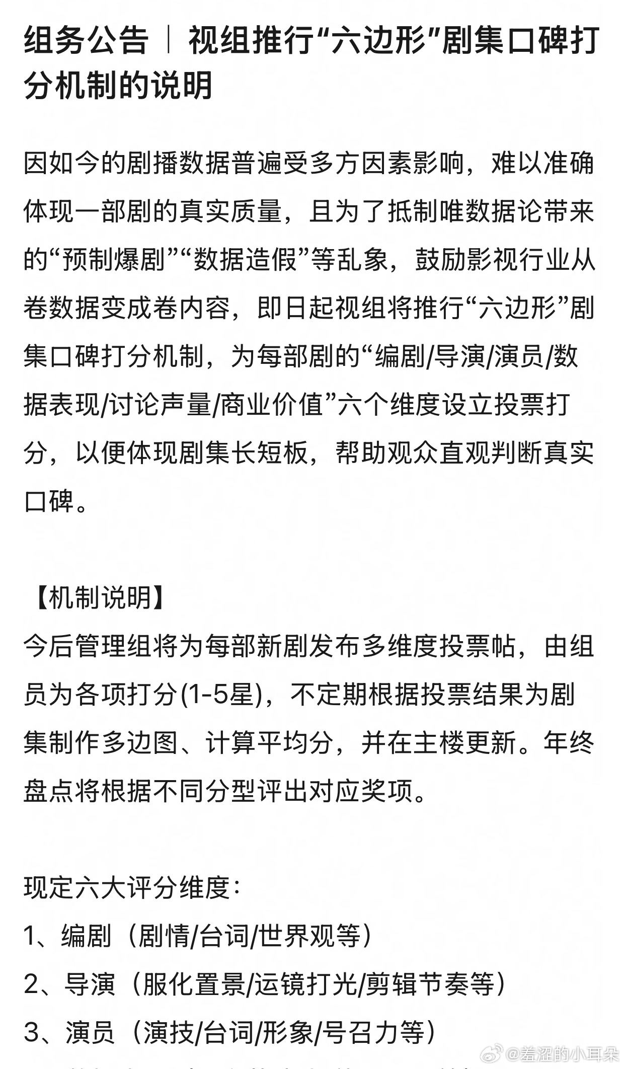 收视率研究中心推出六边形剧集口碑打分机制说明,多维度评价能给长剧治水成功吗