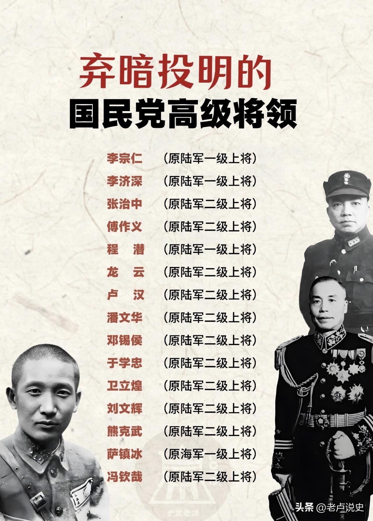 良禽择木而栖,贤臣择主而事,中国自古就不缺聪明人,尤其是在改朝换代的历史关键时刻,每个人都面临着人生、事业的抉择,图中这些人物都是国民党中的高级将领,他们不是国民党军政高官,就是地方实力军阀,是民国的风云人物,他们选择弃暗投明代表着国民党在大陆的统治分崩离析,也侧面体现了我党赢得了天下民心。 历史人物