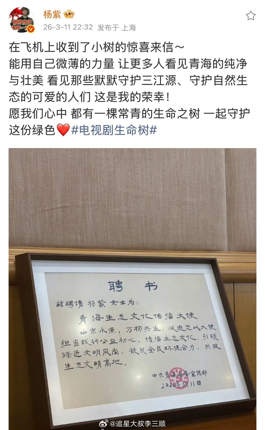 杨紫被聘请为青海生态文化传播大使,太🐮了!