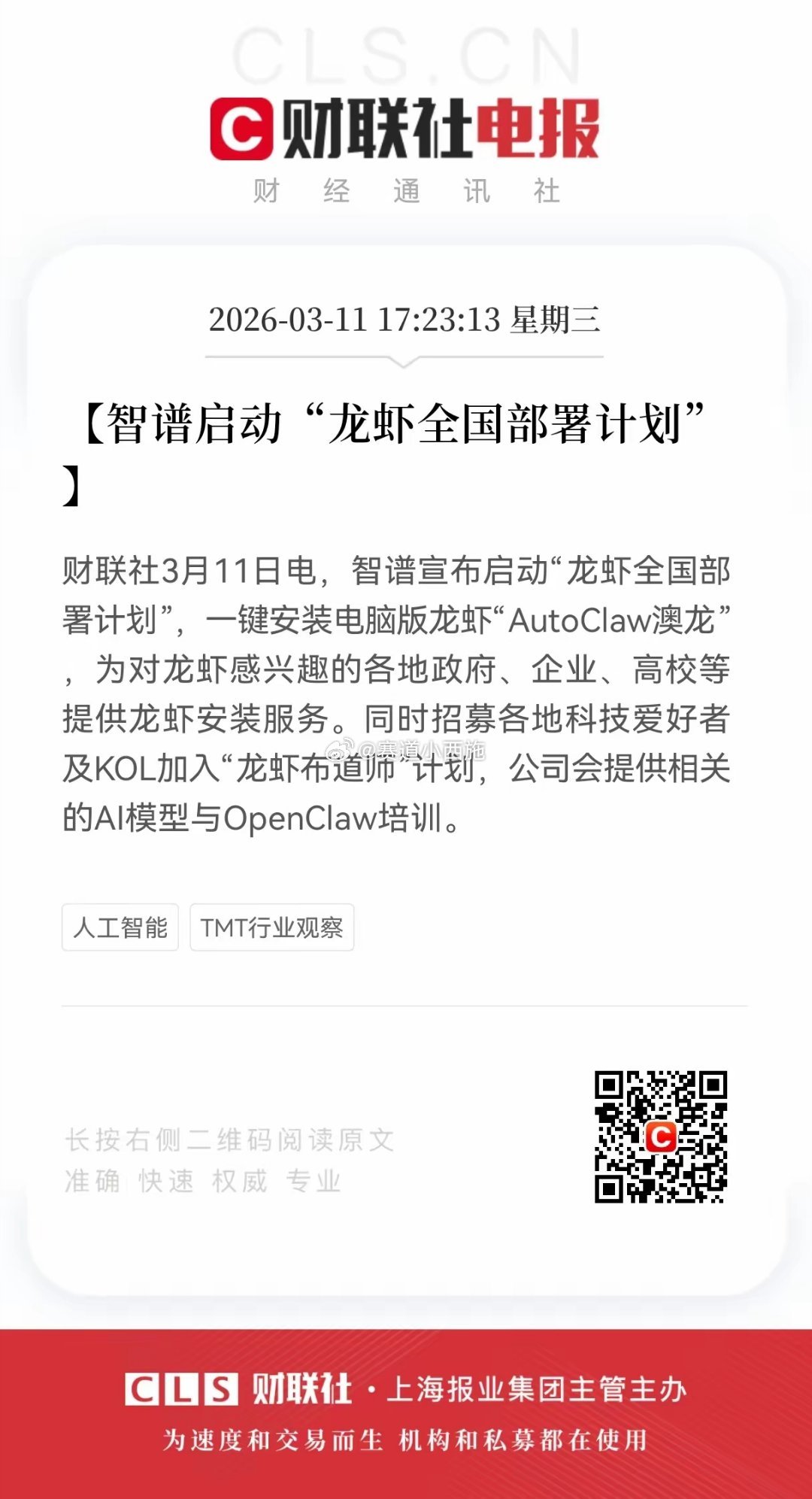 智谱AI“龙虾全国部署计划”重磅落地|AutoClaw全产业链梳理智谱AI启动龙虾全国部署计划,推出AutoClaw(澳龙) 一键安装版,面向政府、企业、高校实现零门槛部署,同步招募“龙虾布道师”加速场景渗透,推动OpenClaw从技术圈走向全民应用,AI智能体规模化落地加速。一、核心逻辑- 零门槛落地:电脑端一键安装、免费培训,覆盖政务、企业、高校、个人全场景- 全民化推广:布道师模式裂变传播,降低使用与教育成本- 产业拐点:AI智能体从尝鲜走向规模化,带动技能包、算力、硬件需求放量二、核心受益标的(四大维度)1、OpenClaw生态核心(直接承接)- 博睿数据(688229):IT运维智能体适配OpenClaw,企业端技能包核心服务商- 优刻得(688158):云平台支撑AutoClaw一键部署,提供弹性算力配套2、AI技能与培训服务商- 拓尔思(300229):文档处理、信息抽取技能包,参与布道师培训内容开发- 科大讯飞(002230):语音办公技能接入,提供政企场景培训服务3、算力与硬件支撑- 中科曙光(603019):AI服务器龙头,支撑大规模本地算力需求- 海光信息(688041):国产DCU芯片,适配国产化算力替代4、政企与高校场景落地- 数字政通(300075):智慧城市+政务数据智能处理- 新开普(300248):高校信息化+校园部署服务三、总结该计划标志AI智能体进入全民可用、场景全覆盖阶段,产业链价值随用户规模快速放大,重点关注生态适配、算力支撑、场景落地三类核心标的。免责声明:以上内容基于公开信息整理,不构成任何投资建议。