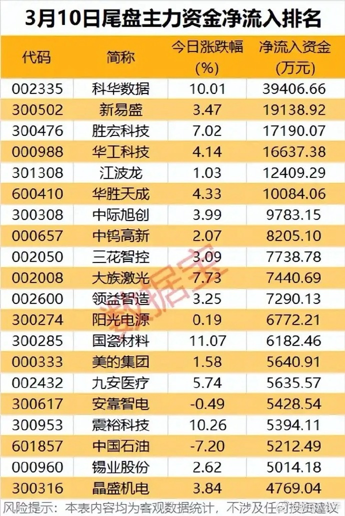 3月10日尾盘主力资金净流入榜单梳理! 尾盘资金净流入呈现科技主线领衔、多板块协同的特征,算力、光模块、存储等硬科技板块个股净流入规模居前,高端制造、新能源、消费家电及医疗板块亦获资金布局,部分传统能源股获逆势流入,资金偏好高成长与业绩确定性兼具的标的。 个股数据分析 1. 科华数据:涨10.01%,尾盘净流入39406.66万元,居榜首。算电协同核心标的,算力业务需求旺盛,资金做多意愿强烈,尾盘大幅流入或受板块景气度及订单预期推动,短期走势偏强。 2. 新易盛:涨3.47%,净流入19138.92万元。光模块核心标的,海外市场需求支撑业绩,光通信板块热度延续,尾盘资金流入体现对其光模块业务及行业景气度的看好。 3. 胜宏科技:涨7.02%,净流入17190.07万元。CPO概念核心股,光模块业务受益于AI算力需求爆发,尾盘资金大幅流入,板块合力下短期或维持强势震荡。 4. 华工科技:涨4.14%,净流入16637.38万元。CPO+光模块双主线,算力需求带动光模块订单增长,尾盘资金流入,技术面企稳,资金看好其在高端光模块领域的布局。 5. 江波龙:涨1.03%,净流入12409.29万元。存储芯片标的,受益于存储行业周期复苏,尾盘资金流入,存储板块景气度提升,资金布局其业绩修复预期。 6. 华胜天成:涨4.33%,净流入10084.06万元。算力+信创标的,云计算业务布局完善,尾盘资金流入,信创与算力板块共振,资金看好其数字化转型业务。 7. 中际旭创:涨3.99%,净流入9783.15万元。光模块龙头,AI算力驱动光模块需求高增,尾盘资金流入,行业龙头地位稳固,资金持续布局其长期成长空间。 8. 中钨高新:涨2.07%,净流入8205.10万元。硬质合金龙头,受益于高端制造及新能源需求,尾盘资金流入,基本面稳健,资金看好其在刀具及新材料领域的拓展。 9. 三花智控:涨3.09%,净流入7738.78万元。热管理系统龙头,新能源汽车及储能业务双轮驱动,尾盘资金流入,行业需求稳定,资金布局其业绩增长确定性。 10. 大族激光:涨7.73%,净流入7440.69万元。激光设备龙头,受益于光伏、半导体及消费电子需求,尾盘资金流入,高端制造板块景气,资金看好其设备更新换代需求。 11. 领益智造:涨3.25%,净流入7290.13万元。消费电子精密制造龙头,切入新能源汽车及算力领域,尾盘资金流入,业务多元化布局,资金看好其转型成长空间。 12. 阳光电源:涨0.19%,净流入6772.21万元。光伏逆变器龙头,储能业务快速增长,尾盘资金流入,光伏板块企稳,资金布局其在储能及海外市场的拓展。 13. 国瓷材料:涨11.07%,净流入6182.46万元。陶瓷材料龙头,受益于新能源及电子陶瓷需求,尾盘资金流入,业绩增长确定性强,资金追高其高景气赛道布局。 14. 美的集团:涨1.58%,净流入5640.91万元。白电龙头,智能家居及海外业务拓展,尾盘资金流入,消费复苏预期下,资金布局其稳健的基本面与分红优势。 15. 九安医疗:涨5.74%,净流入5635.57万元。医疗检测设备标的,家用医疗及慢病管理业务推进,尾盘资金流入,医疗板块情绪回暖,资金看好其消费医疗场景拓展。 16. 安靠智电:跌0.49%,净流入5428.54万元。高压输电设备标的,电网投资加速,尾盘资金逆势流入,资金博弈其在特高压及新型电力系统中的业务机会。 17. 震裕科技:涨10.26%,净流入5394.11万元。新能源结构件龙头,受益于动力电池及储能需求,尾盘资金流入,新能源板块景气,资金追高其业绩高增预期。 18. 中国石油:跌7.20%,净流入5212.49万元。油气龙头,油价波动下尾盘资金逆势流入,资金博弈其低估值防御属性及分红优势,传统能源板块获资金关注。 19. 锡业股份:涨2.62%,净流入5014.18万元。锡金属龙头,受益于半导体及新能源需求,尾盘资金流入,金属价格企稳,资金看好其稀缺资源属性及业绩修复。 20. 晶盛机电:涨3.84%,净流入4769.04万元。光伏设备龙头,硅片生长设备市占率领先,尾盘资金流入,光伏设备板块景气,资金布局其在半导体设备领域的拓展潜力。 总结 整体来看,3月10日尾盘资金高度聚焦硬科技成长赛道,算力、光模块、存储等AI相关板块获主力重仓,高端制造、新能源等景气赛道亦获持续布局,消费、医疗及传统能源板块获资金防御性配置。资金流向反映出市场对高成长、高确定性标的的偏好,科技主线仍是核心方向,传统板块仅获阶段性资金关注。