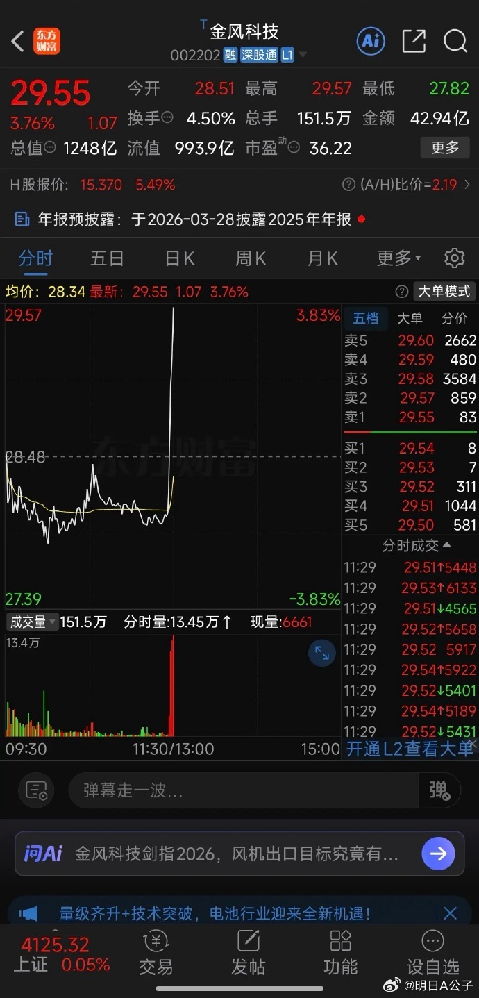什么情况?上午接近收盘最后一刻,金风科技走出这形态?