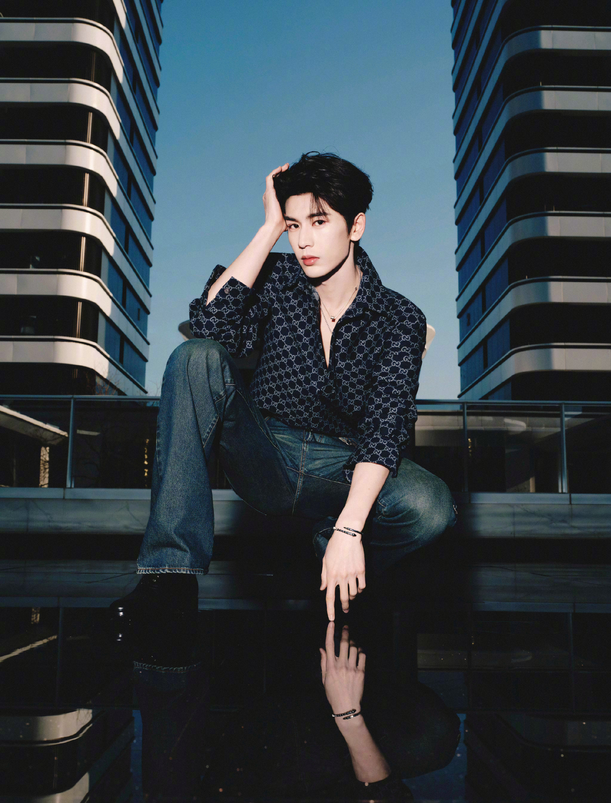 张凌赫 今日 逐玉 剧宣造型图,像是品牌的宣传画册,全套Gucci服饰出镜,双G印花衬衫配牛仔裤,佩戴BVLGAR珠宝,冷峻有型的模特气场~ 张凌赫钝感力