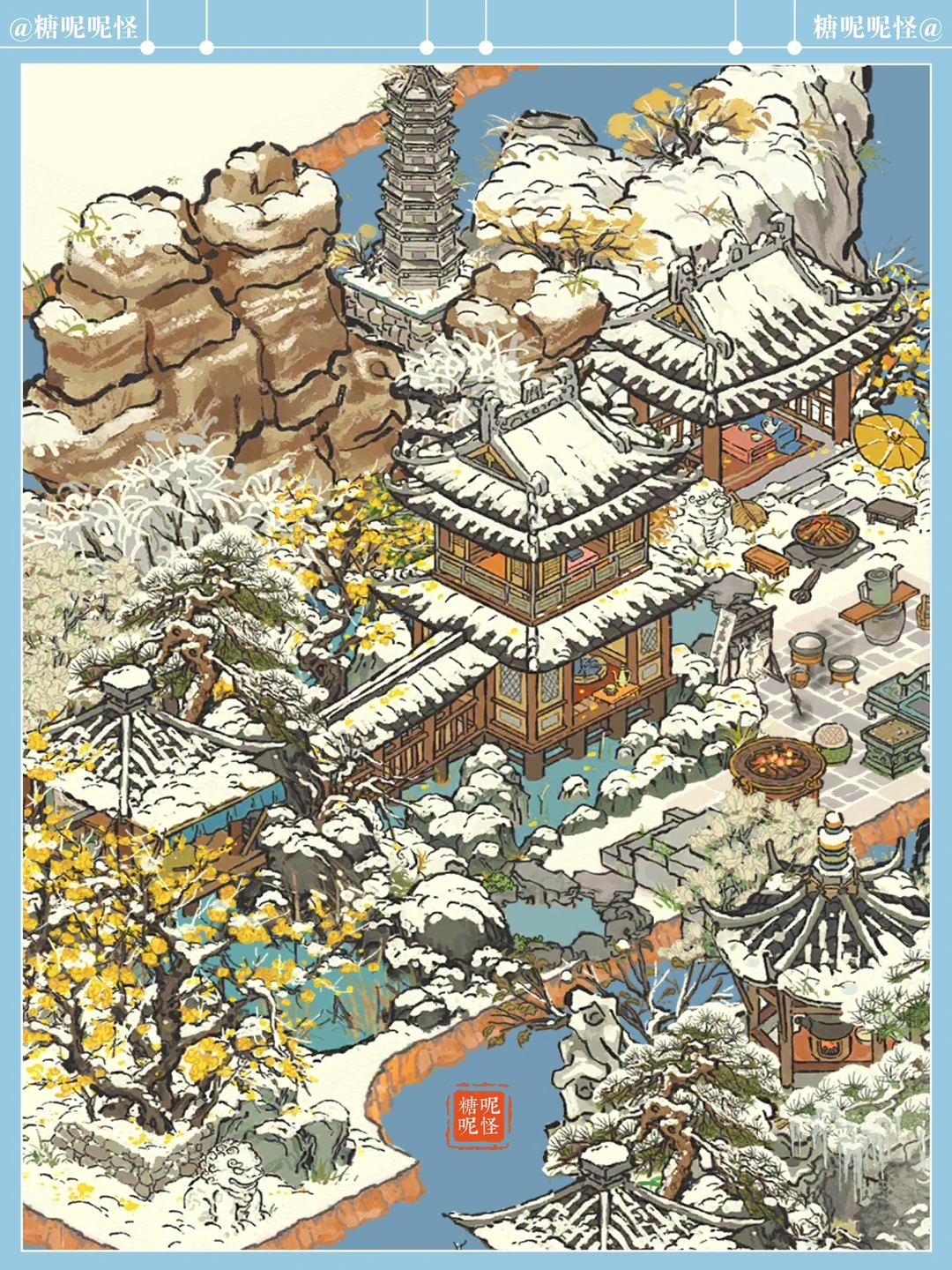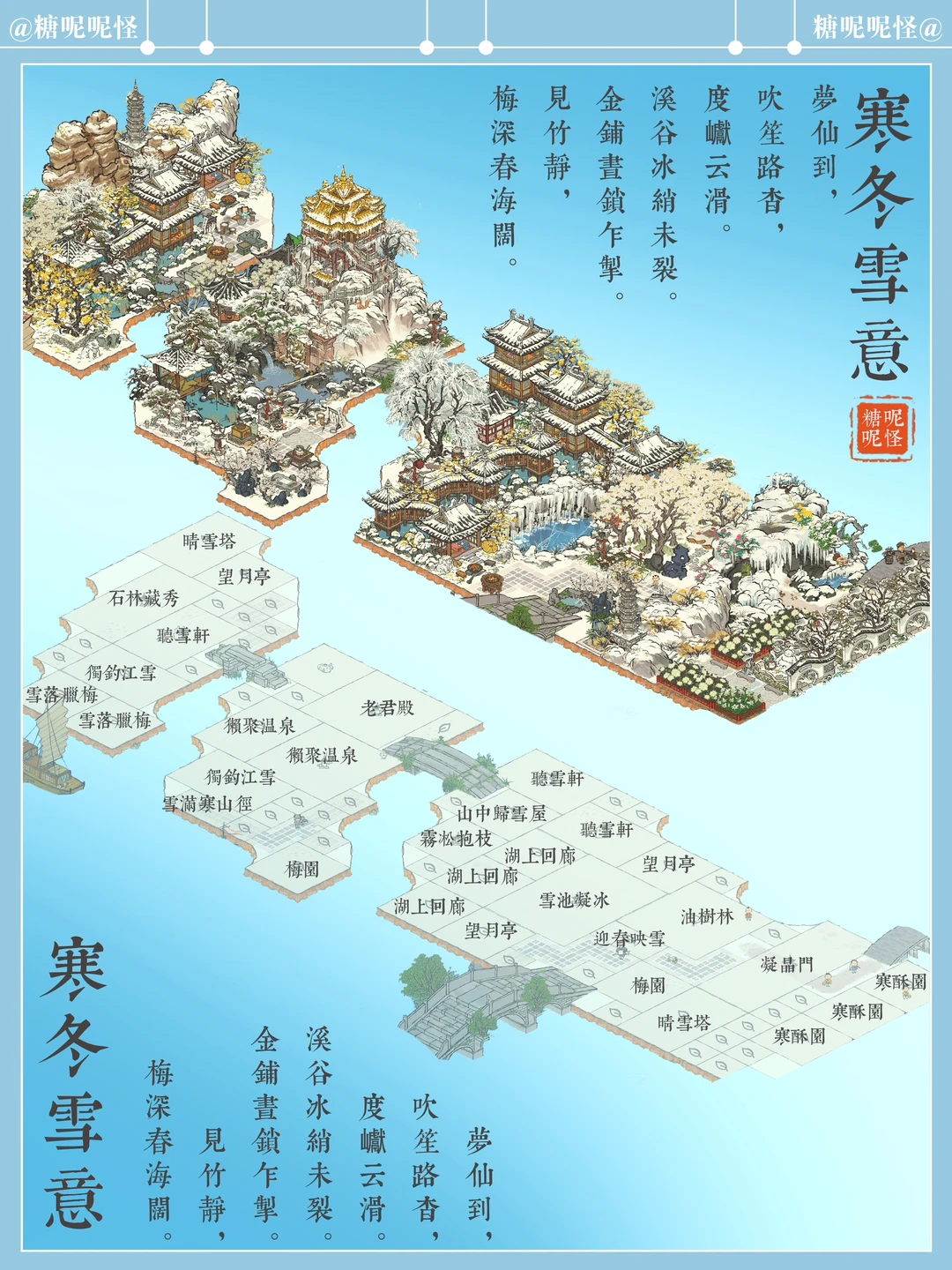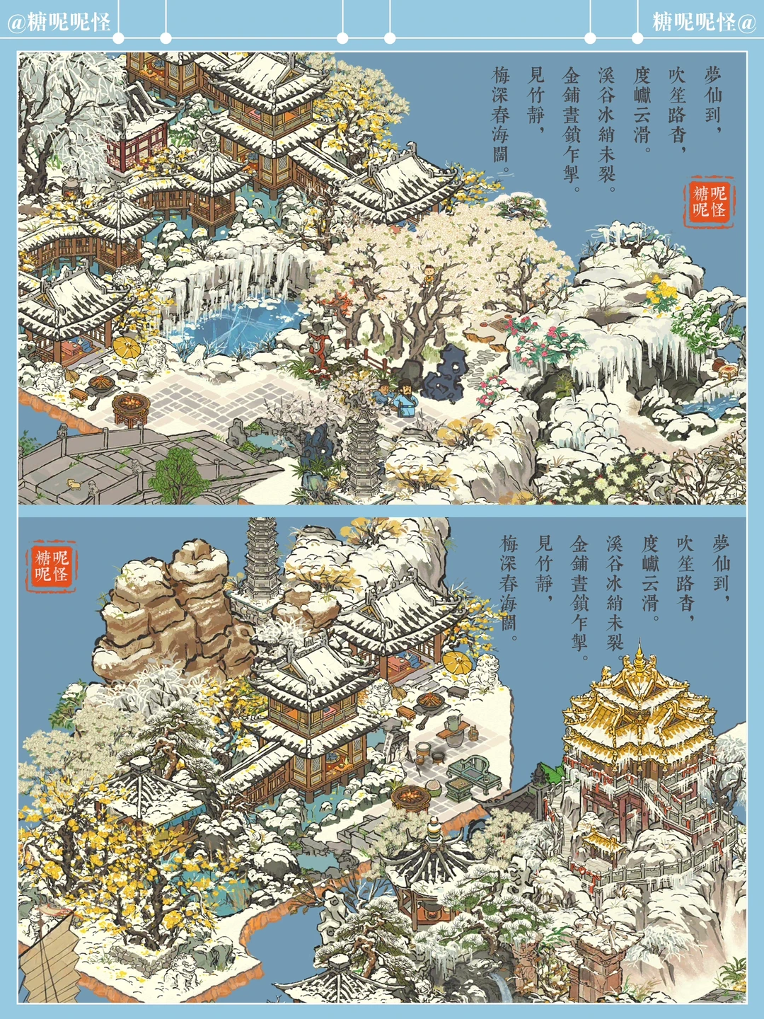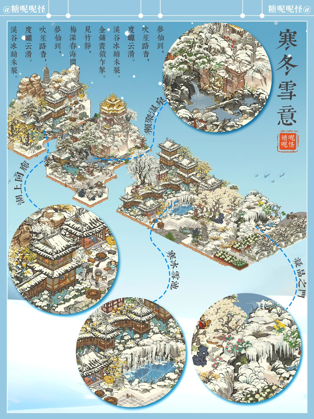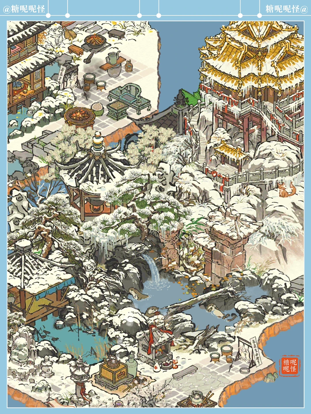 在【江南百景图】中赏雪…… 可以盯着看许久许久的雪景…… 【老君殿】的山上有两只橘色小狐狸,纵上雪山玩闹,忽而又一头扎进雪岭深处…… 【雪池凝冰】的冰池边枯木下有个松鼠窝,一只松鼠🐿️时而上来池边采果…… 【獭聚温泉】里有三只小水獭,惬意享受这浪漫的冬日时光……
