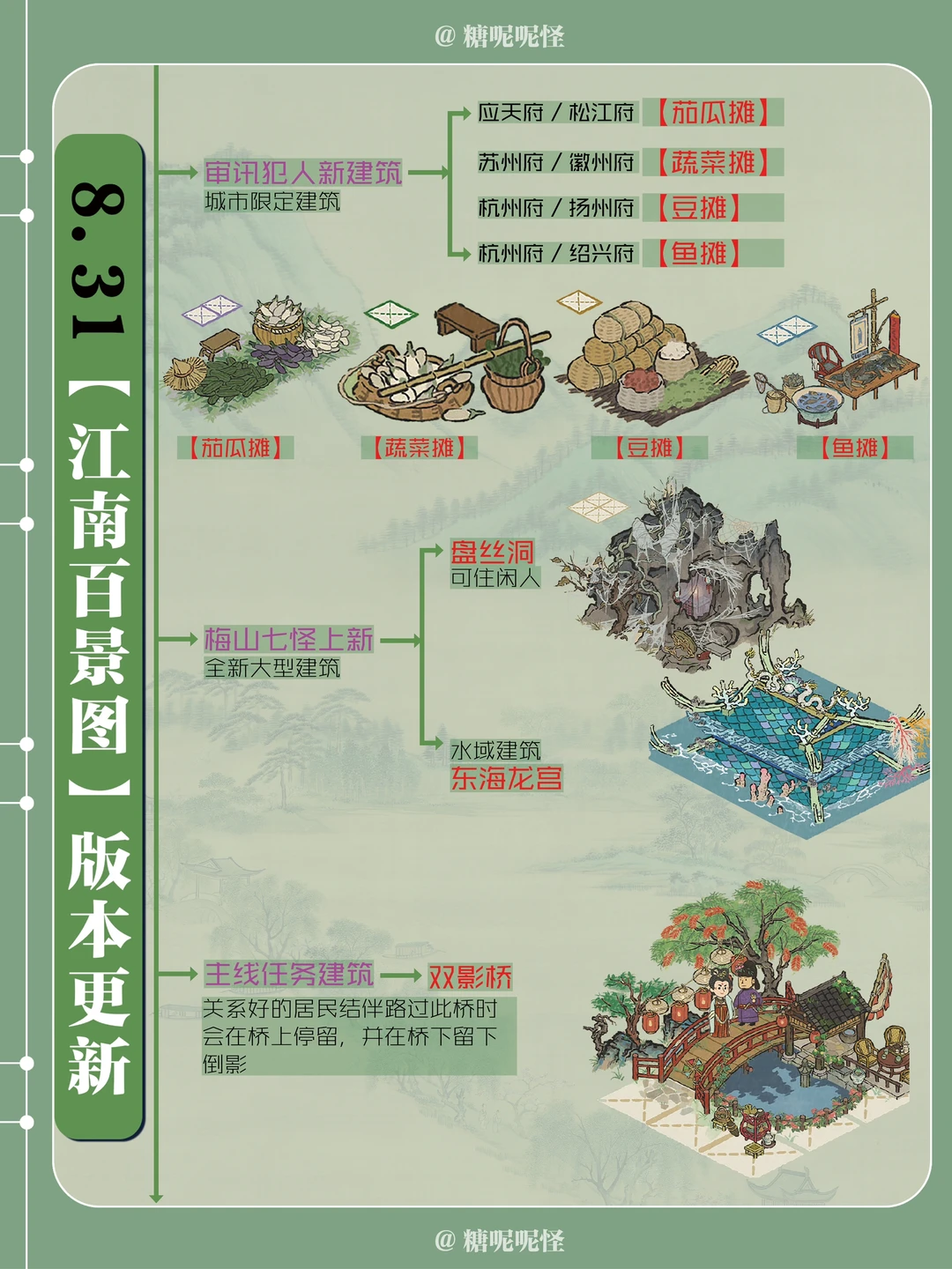 又是新卷法[生气R][生气R][生气R][抓狂R][抓狂R][抓狂R]还好都是新建筑[大笑R][大笑R][大笑R][暗中观察R][暗中观察R][暗中观察R] 新建筑: 【铜镜厂】【铜镜店】【风雅琴院】【月上楼阁】【三司会审】【探远绘星】【盘丝洞】 【东海龙宫】【双影桥】【大仓库】 新装饰: 【柏树】【金合欢】【石篱】 新小摊: 【茄瓜摊】【蔬菜摊】【豆摊】【鱼摊】