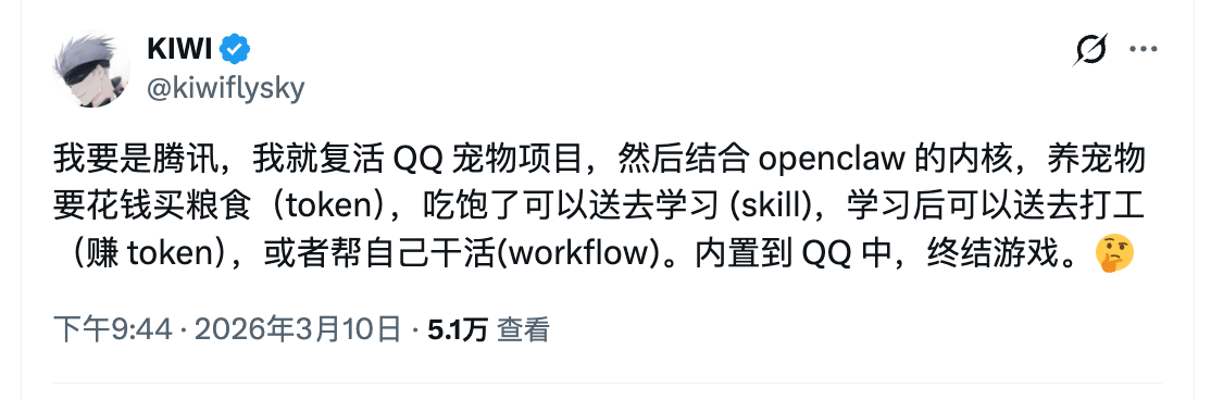 真的,腾讯更新一下,什么 QQ 宠物、QQ 秀、QQ 农场、QQ 空间,都复活一把,让大家的龙虾感受下互联网昔日的荣光。