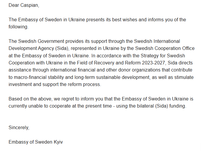 瑞典驻乌克兰大使馆好评!最近协助乌克兰本地NGO,以求实现对前线城市苏梅家庭的能源援助。发邮件询问,他们回复邮件说明了情况。