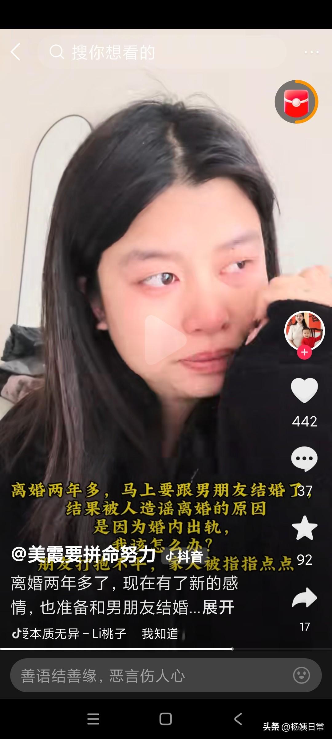 戏精美霞,今天发了一条41秒的视频,又在演戏,他整个视频没有说一句话,只是见他屏幕上写着四五行字,内容写着, 离婚两年半,马上就跟男朋友结婚了,结果被人造谣离婚的原因,是因为婚内出轨,问,我怎么办? 然后就是看见美霞的眼眶红。擦眼泪。他哭的那么伤心,但又看不见他有眼泪流出来, 美霞说他被人造谣离婚的原因,是因为婚内出轨,这话,美霞以前都说过几次了,今天又拿这话出来说,一个话题,拿出来说几次,又有什么意思?没有话题说了,又拿这些话来炒旧饭,来博流量。有很多网友说美霞是个戏精,他确实是个戏精,没有东西拍了,又随便拍一段不说话的视频,炒炒旧饭,假装流泪, 又博到一次流量。美霞这个女人太会演戏了。