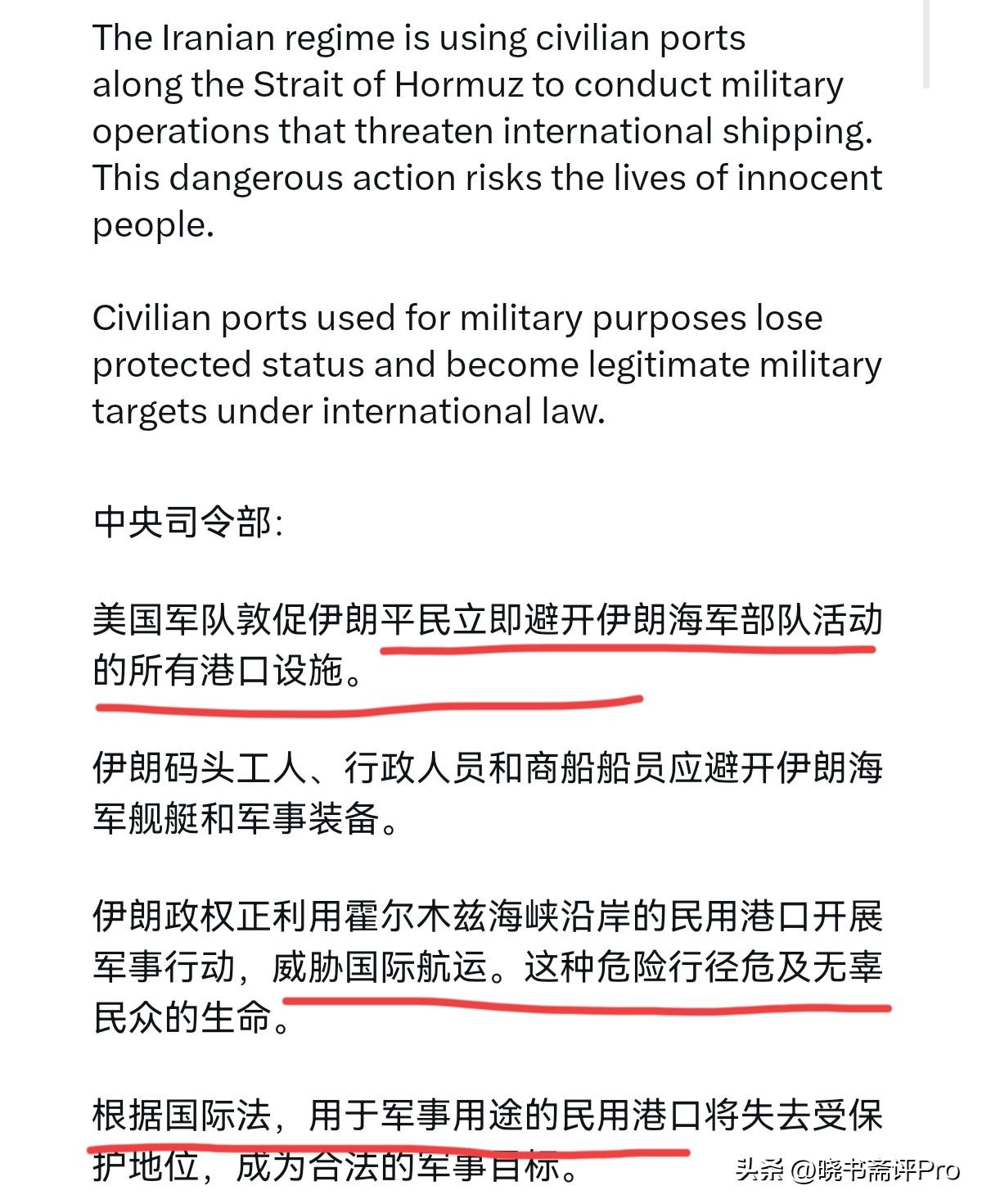 美国准备下狠手了,美国发出最后通牒!3月11日,美国中央司令部警告称,美国军队敦促伊朗平民立即避开伊朗海军正在运作的所有港口设施,伊朗码头工人、行政人员和商业船只船员应避免使用伊朗海军舰艇和军事装备。伊朗政权正在利用霍尔木兹海峡沿岸的民用港口进行威胁国际航运的军事行动。这一危险行动危及无辜人民的生命。 根据国际法,用于军事目的的民用港口失去了受保护的地位,将合法军事目标。很显然,美军的这一通告,这就是对伊朗发出了最后通牒。美国此举目的何在呢?说白了,就是要伊朗进行二选一。要么伊朗海军的布雷船、舰艇赶紧撤出民用港口,要么伊朗就等着美军对伊朗港口进行无差别的打击。无疑,美军此举就是要彻底摧毁伊朗的海军力量,打通霍尔木兹海峡,让伊朗彻底失去封锁能力。 当然,美军方面非常搞笑的是,美国打击伊朗这本身就违反了国际法,结果美国还要以国际法的名义为自身的非法行为披上外衣,这无疑是把国际法当成是了自己为非作歹的遮羞布。不过,话又说回来,即便美国摧毁了伊朗的海上力量,美国能够彻底让伊朗不用无人机,导弹打击海上目标吗?很显然,美国根本做不到这一点。因此,虽然美国要出狠手,但最终未必能够达成目的。