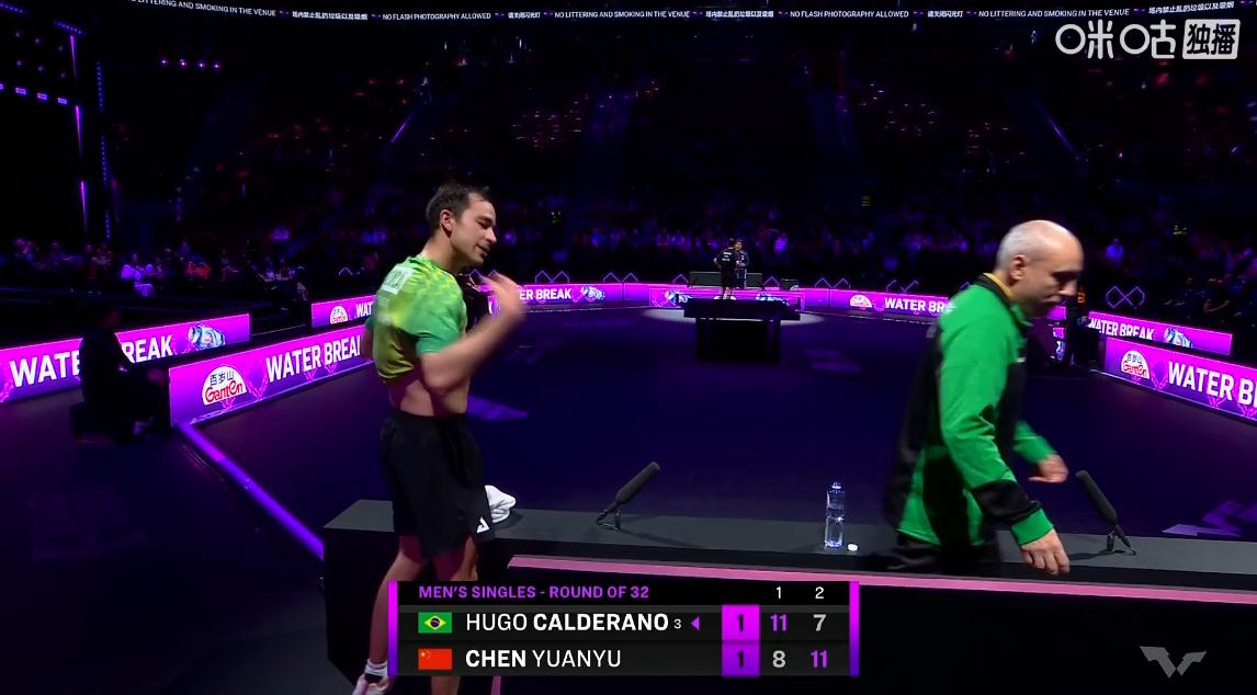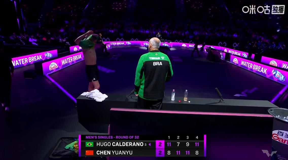 雨果到底准备了几件球衣, 打完一局就换一件衣服, 看来陈垣宇给的压力不小, 原本雨果就特别能出汗, 现在被陈垣宇打成2-1, 第四局肯定会出更多的汗, 有个疑问,雨果到底带了几件球衣, 现在陈垣宇越打越勇, 看来又要淘汰雨果了