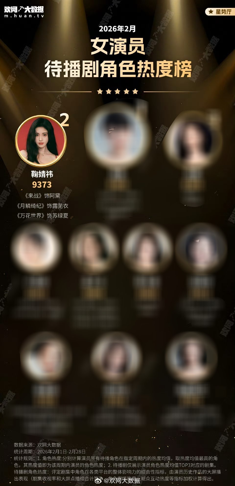 2月女演员待播剧角色热度榜前十鞠婧祎这3部待播剧已经很久没新物料了,还能排名女星top2