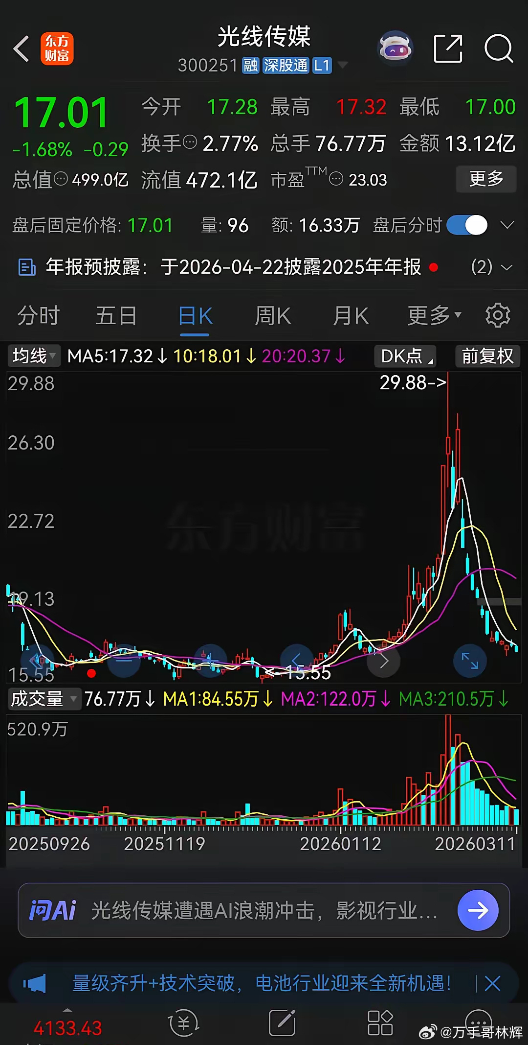 光线传媒从节后一路崩盘式下跌,上演“A字”杀,仔细数了一下,年后到今天为止,一共12个交易日,有11天都是下跌的,仅有的一天上涨,只涨了2分钱,涨幅为 0.12%。截至今天收盘,光线传媒股价报收于17.01元,已经较高点下跌了43%,也是今年以来A杀最惨的股票了,弹都不弹,真正的爆炒过后,一地鸡毛。