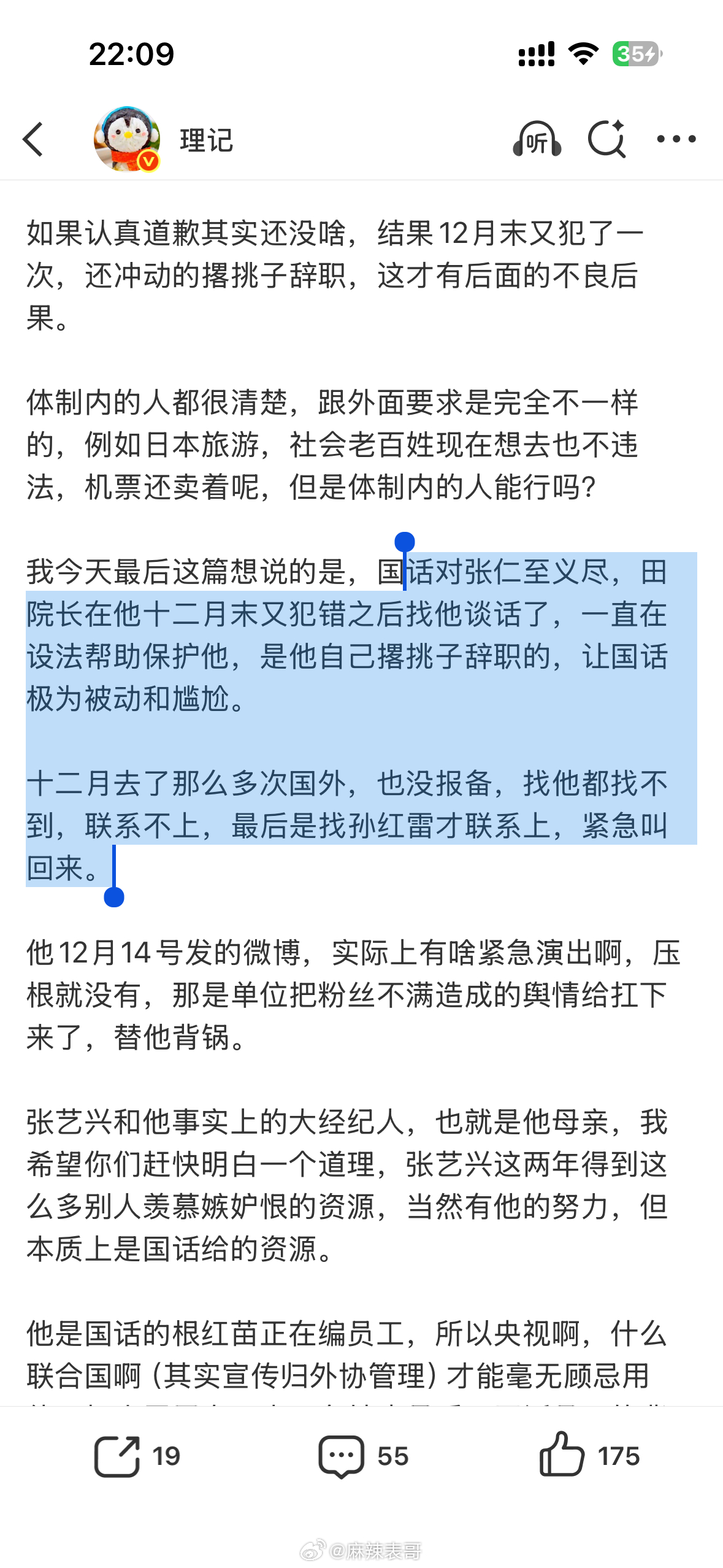 理记又发长文说了张艺兴从国家话剧院辞职的事,说「违反政治纪律,涉及敏感重大外交利益」。