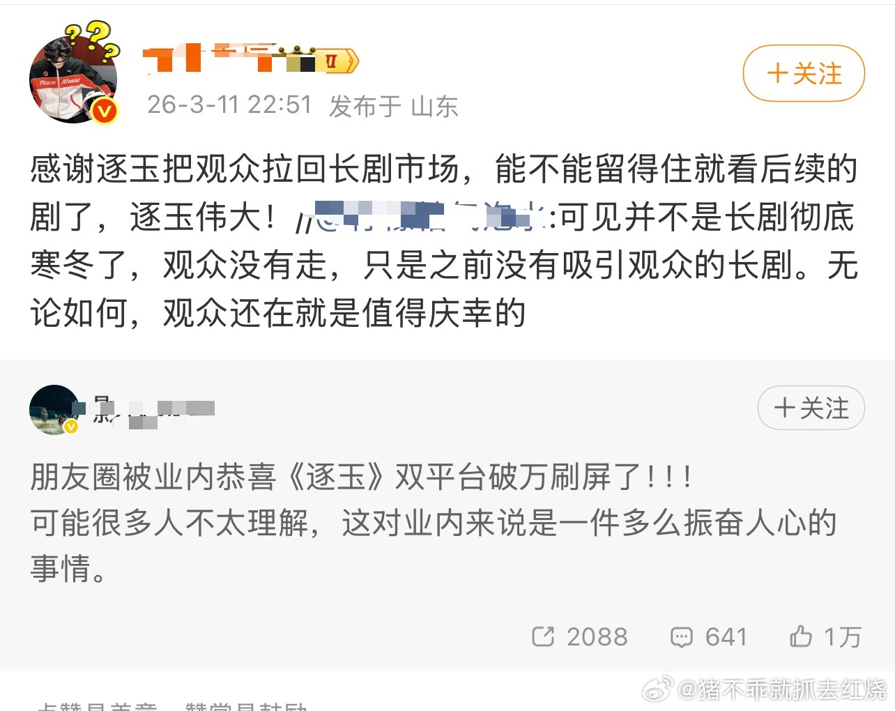 “感谢逐玉把观众拉回长剧市场,能不能留得住就看后续的剧了,逐玉伟大!!”