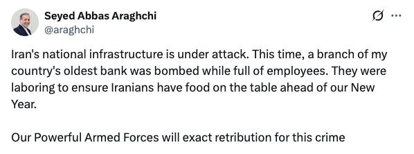 突发新闻——伊朗外长阿拉克奇表示: “伊朗国家基础设施正遭到袭击。此次,我国历史最悠久银行的一家分行在满是员工时遭轰炸。他们正辛勤工作,确保伊朗民众在新年前能有饭吃。 我们强大的武装力量必将为这一罪行实施报复。” 消息来源——德黑兰时报