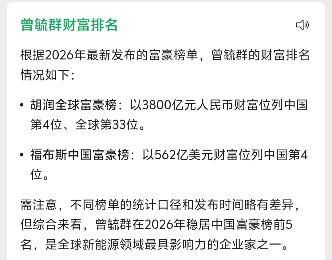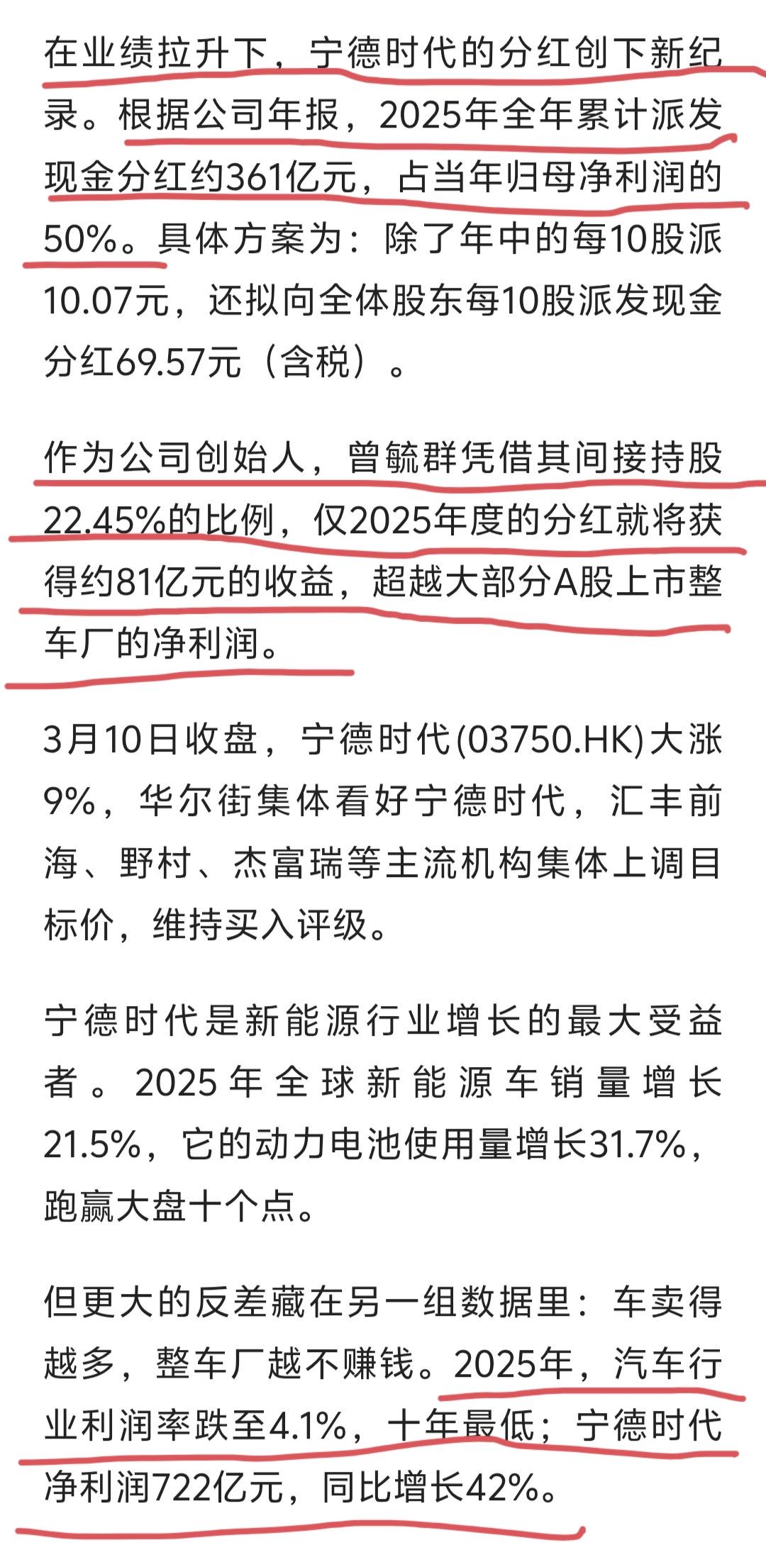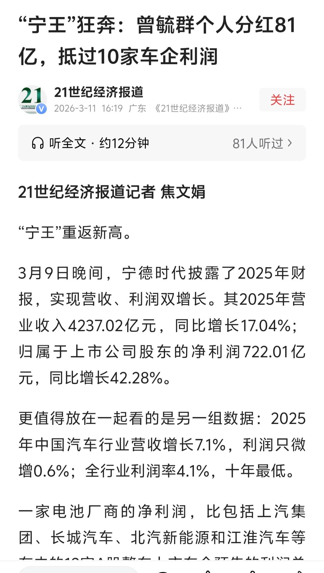 宁王真的不是白叫的,宁德时代老板一个人去年拿到的分红高达81亿元,这笔钱不仅是赛力斯年利润的两倍,更是抵得上10家中小车企的利润总和,贫穷真的限制了我的想象。 宁德时代2025年赚了722.01亿元,拿一半的利润共361亿出来分红,创始人兼实控人曾毓群去年拿到的分红近81亿元,他2026年以3800亿元人民币财富位列胡润全球富豪榜中国第4、全球第33,以562亿美元位列福布斯中国富豪榜第4,是全球新能源领域极具影响力的企业家。 印象中,鸿蒙智行每次开新车发布会,或者赛力斯搞什么大的庆祝活动,宁德时代的曾总都前去帮衬站台,谁能想到,总是笑眯眯的曾老板,一年的分红就是赛力斯利润的两倍啊! 更有意思的是,车卖得越多整车厂越不赚钱,2025年汽车行业利润率跌至十年最低的4.1%,而宁德时代净利润却暴涨42%。不喜欢说狠话,总是笑眯眯的曾老板,他的企业竟然有着碾压整车行业的赚钱能力。宁德时代 宁德时代的净利润增长是否能持续