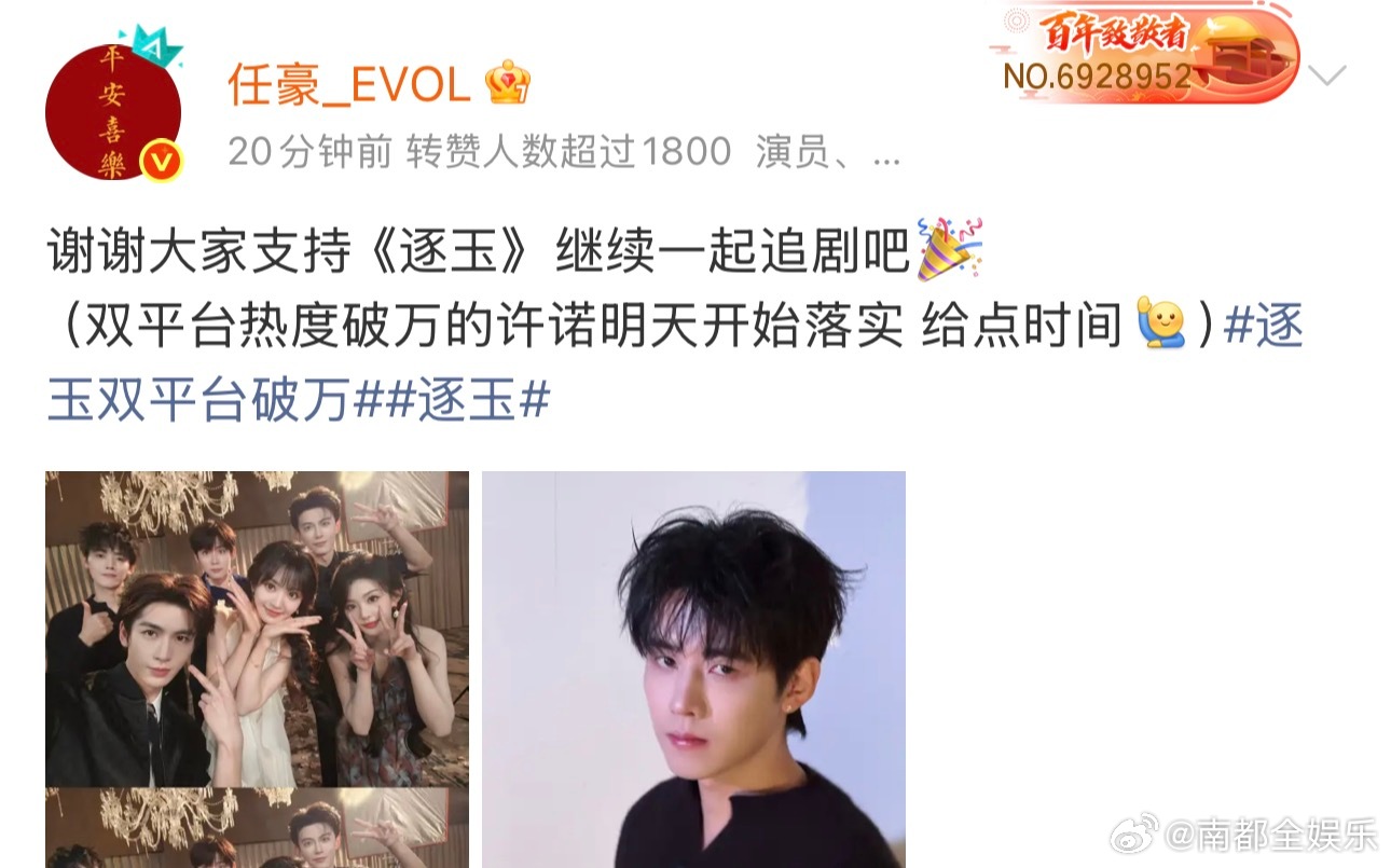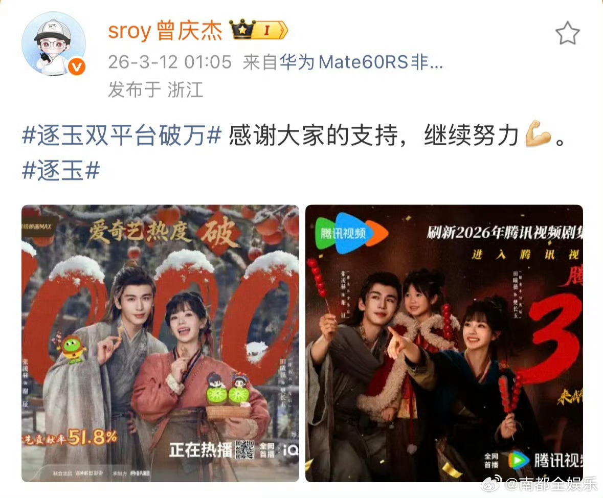 逐玉首部双平台破万剧张凌赫95生唯一三平台破万男主逐玉双平台热度破万3月11日,古装剧《逐玉》在爱奇艺站内热度突破10000点、腾讯视频热度突破30000点,成为首部实现双平台同步破万的剧集!导演曾庆杰、主演张凌赫、田曦薇、孔雪儿、任豪等都发文感谢观众的支持。这部开年第一爆剧,你觉得好看吗?