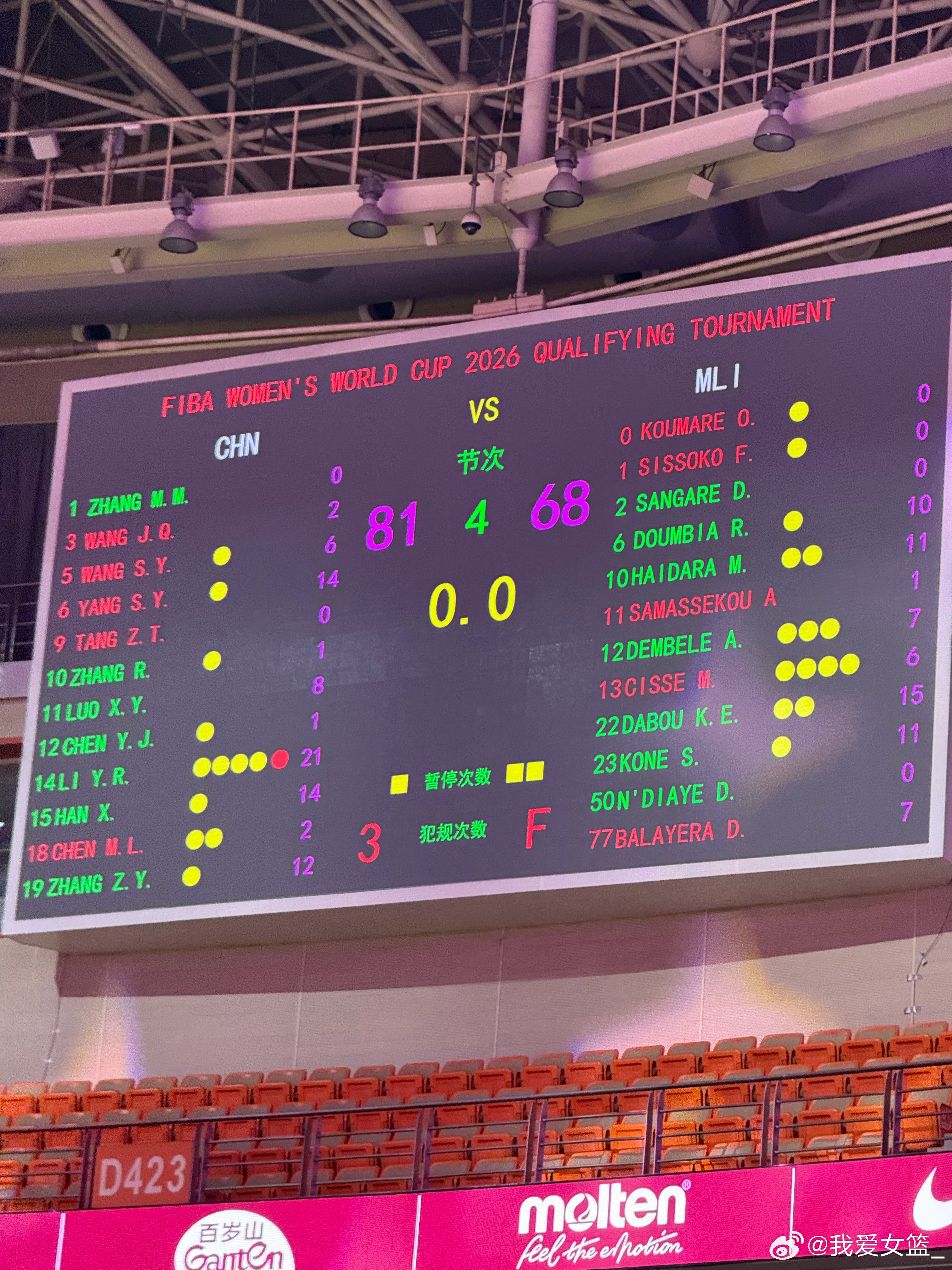 【 中国81-68马里 赢下女篮世界杯资格赛开门红】首节比赛,中国女篮进入状态较慢,在落后的情况下,韩旭独得九分稳住局面,随后张子宇压哨两分打进,首节双方战至20平。第二节,王佳琦成为中国女篮进攻发动机,连续送出精彩助攻,帮助中国女篮创造领先优势。半场结束,中国女篮35-29暂时领先6分。 下半场,战况依然十分激烈,马里一度要扳平比分。但是中国女篮依靠张子宇在内线的发挥,也一度取得两位数领先优势。第四节李月汝迎来大爆发,先是命中三分,随后多次打进2+1,一举将比分拉开,比赛就此失去悬念,中国女篮收下开门红。女篮世界杯资格赛