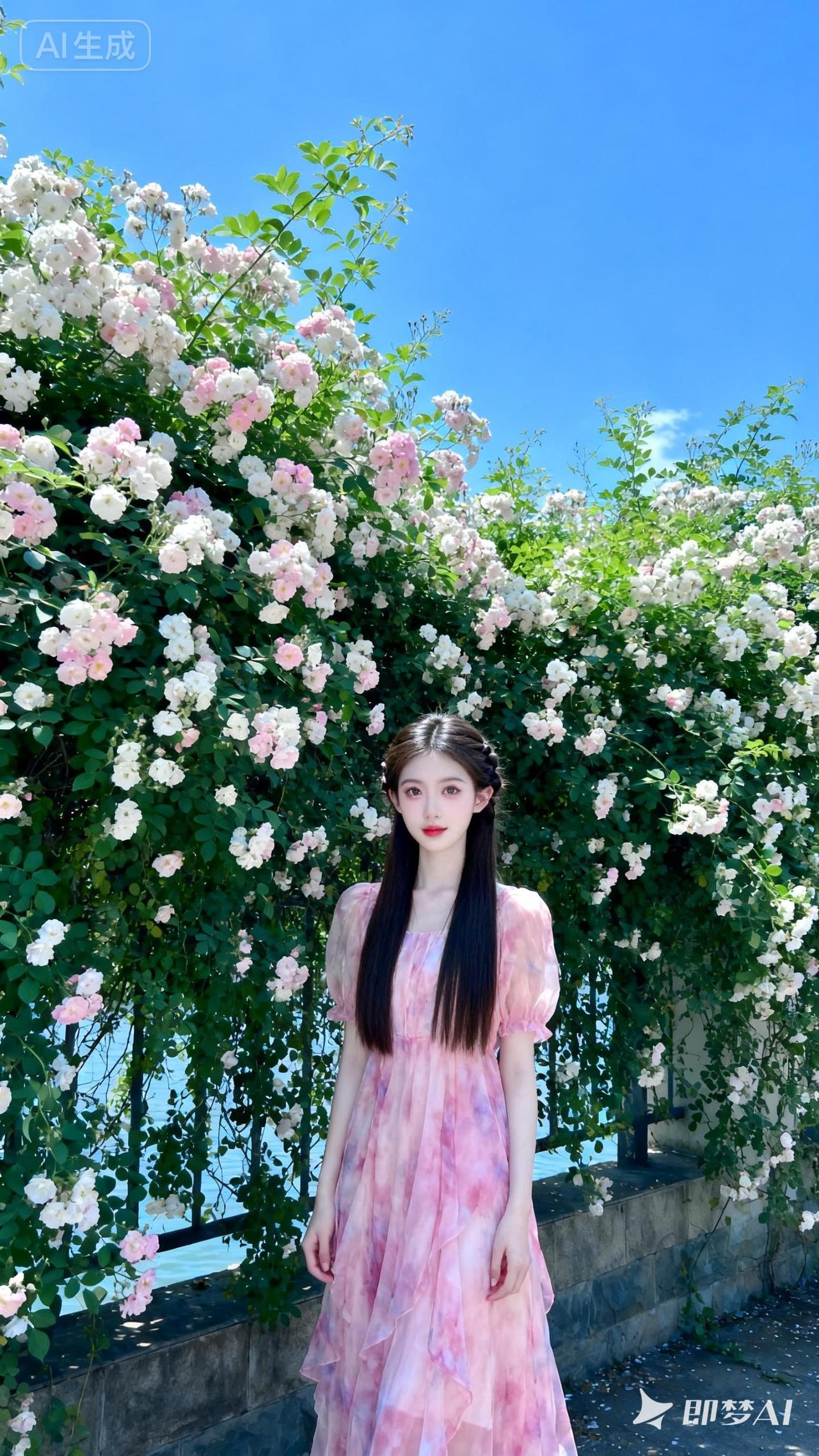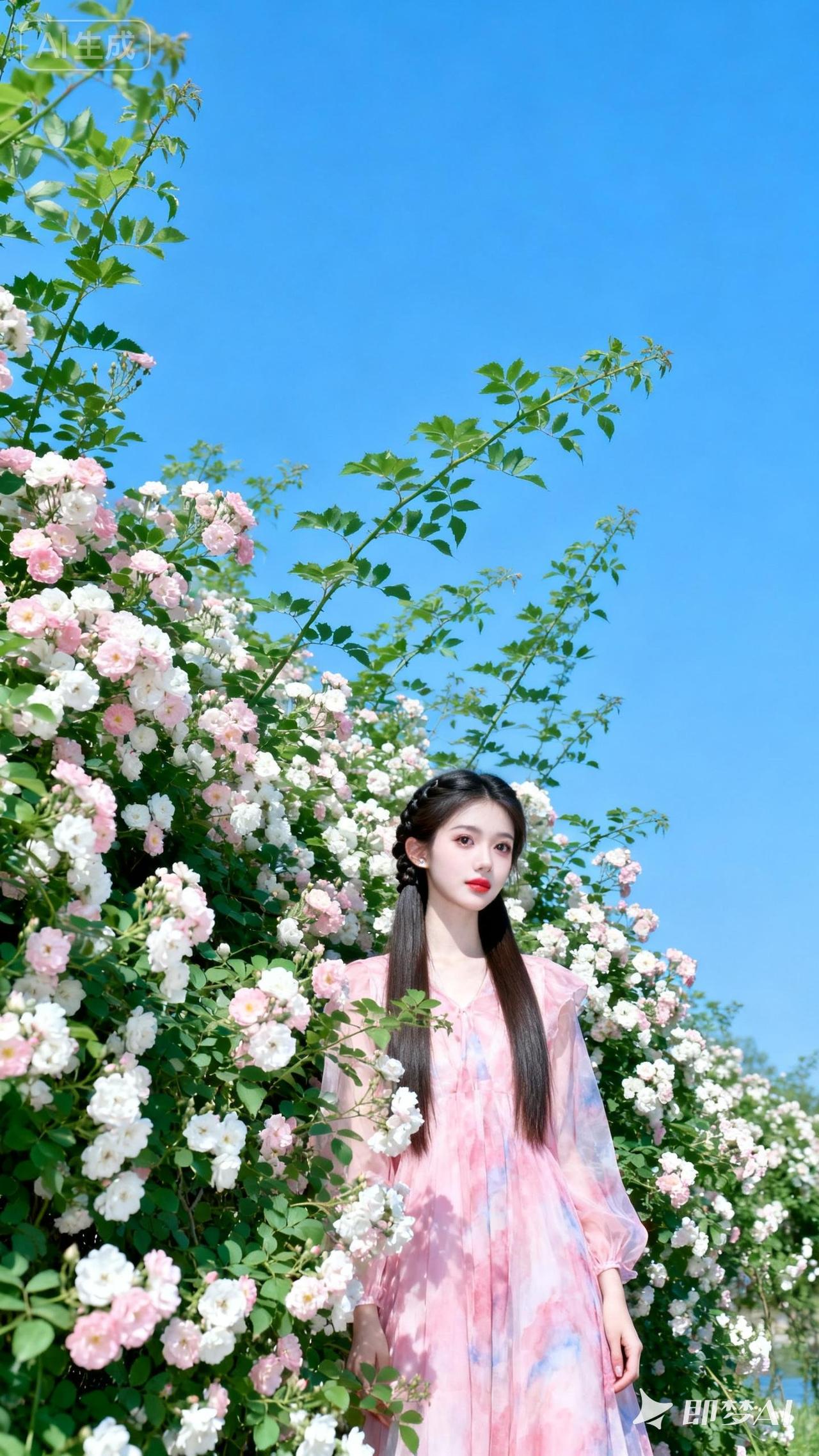 18岁亚洲甜妹,冷白皮陶瓷肌,中分甜妹编发长直发,粉色晕染纱裙。湛蓝天空下粉白蔷薇环绕,冷调高曝光,超清特写,温柔羞怯,光影高级。