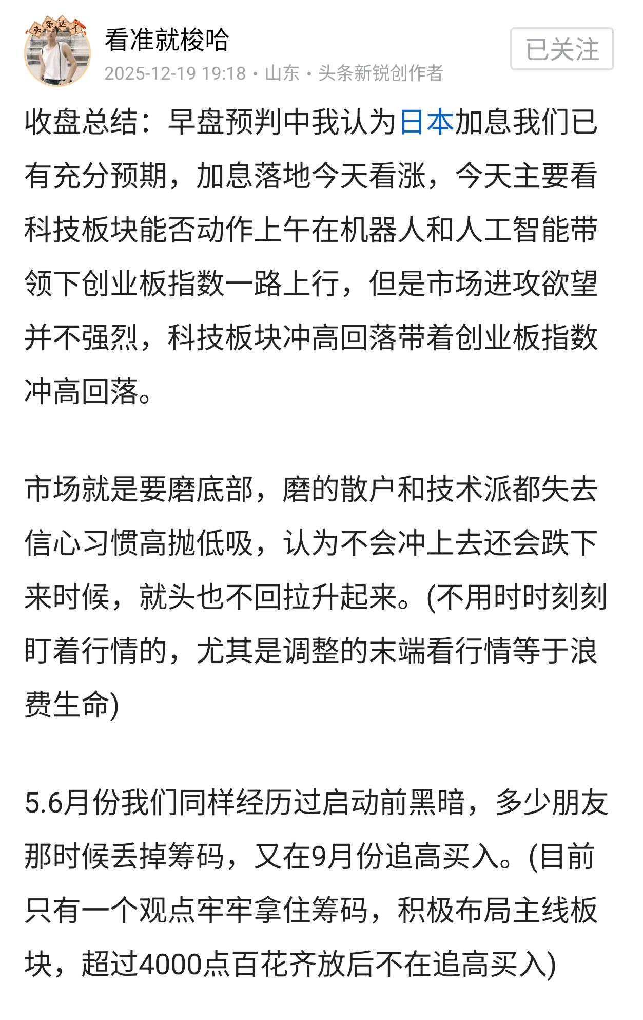 早盘预判:A股行情最近明显跷跷板效应,周三手中嘉实中证电池大涨4%,周二机器人板块、周一创新药板块因无明显增量资金所以轮动上涨为主。12.19日文章讲到市场就要磨底,磨到大家习惯高抛低吸不相信行情就头也不会拉升。目前我们又处于类似12月份行情启动前最容易丢失筹码阶段。 今天大盘会怎么走?今天上证指数会回踩5日线位置蓄力后继续往上突破。创业板指数目前存在2个跳空缺口。(我认为目前只会回补第一个蓄力) 用12.9文章最关键一句话收尾,目前只有一个观点牢牢拿住筹码并积极布局主线板块,超过4197点位再现百花齐放不在追高买入。 你认为股市短期会有波动吗 努力赚钱最终是为了什么