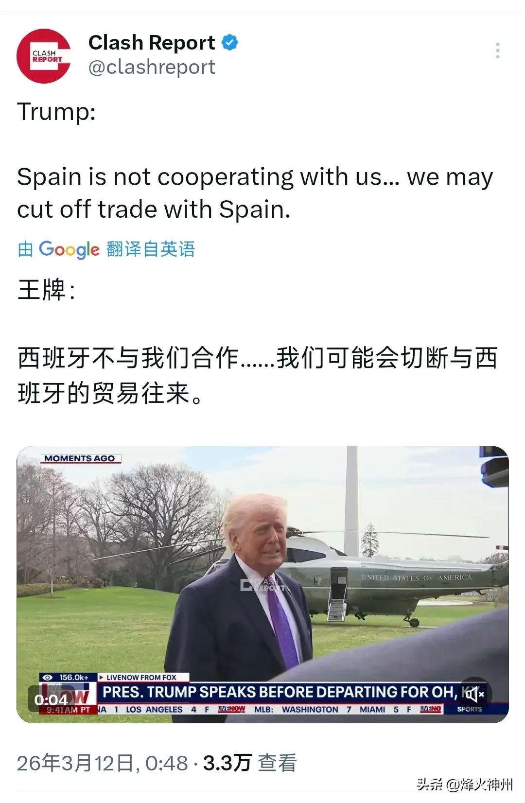 特朗普今天(北京时间3月12日)接受采访时表示:“西班牙不与我们合作……我们可能切断与西班牙的贸易往来。” 评几句: 特朗普最新采访直接甩出狠话:西班牙不合作,美国就可能切断双边贸易!一句话,把美欧矛盾彻底摆上台面。 导火索很清楚:西班牙拒绝美军用基地参与对伊行动、坚持国际法底线,同时不愿按美方要求把军费抬到5%,触怒了白宫。特朗普的逻辑很粗暴:盟友必须听话,不顺从就用贸易大棒打压。这不是盟友协商,是强权命令。 威胁切断贸易,本质是把经济武器化,用单边制裁绑架国际规则。西班牙是欧盟核心成员,美西贸易牵扯数百亿欧元产业链,一旦动手,汽车、农产品、能源、航运全线震动,欧洲市场必然震荡。欧盟已经力挺西班牙,这不再是美西双边摩擦,而是美国单边主义与欧洲战略自主的正面碰撞。 更值得警惕:美国把北约军费、军事基地、贸易制裁绑在一起,用霸权手段逼选边站。西班牙说“不要战争”,守住的是主权与和平底线;特朗普挥起贸易屠刀,暴露的是唯我独尊的霸凌本质。 这场风波告诉世界:靠威胁搞不来忠诚,用制裁守不住霸权。欧洲要团结,全球更要清醒——国家不分大小,主权不容侵犯,规则不能由一家说了算。单边霸凌可以嚣张一时,但终究走不远;坚持独立自主、维护公平正义,才是国际社会的人心所向。
