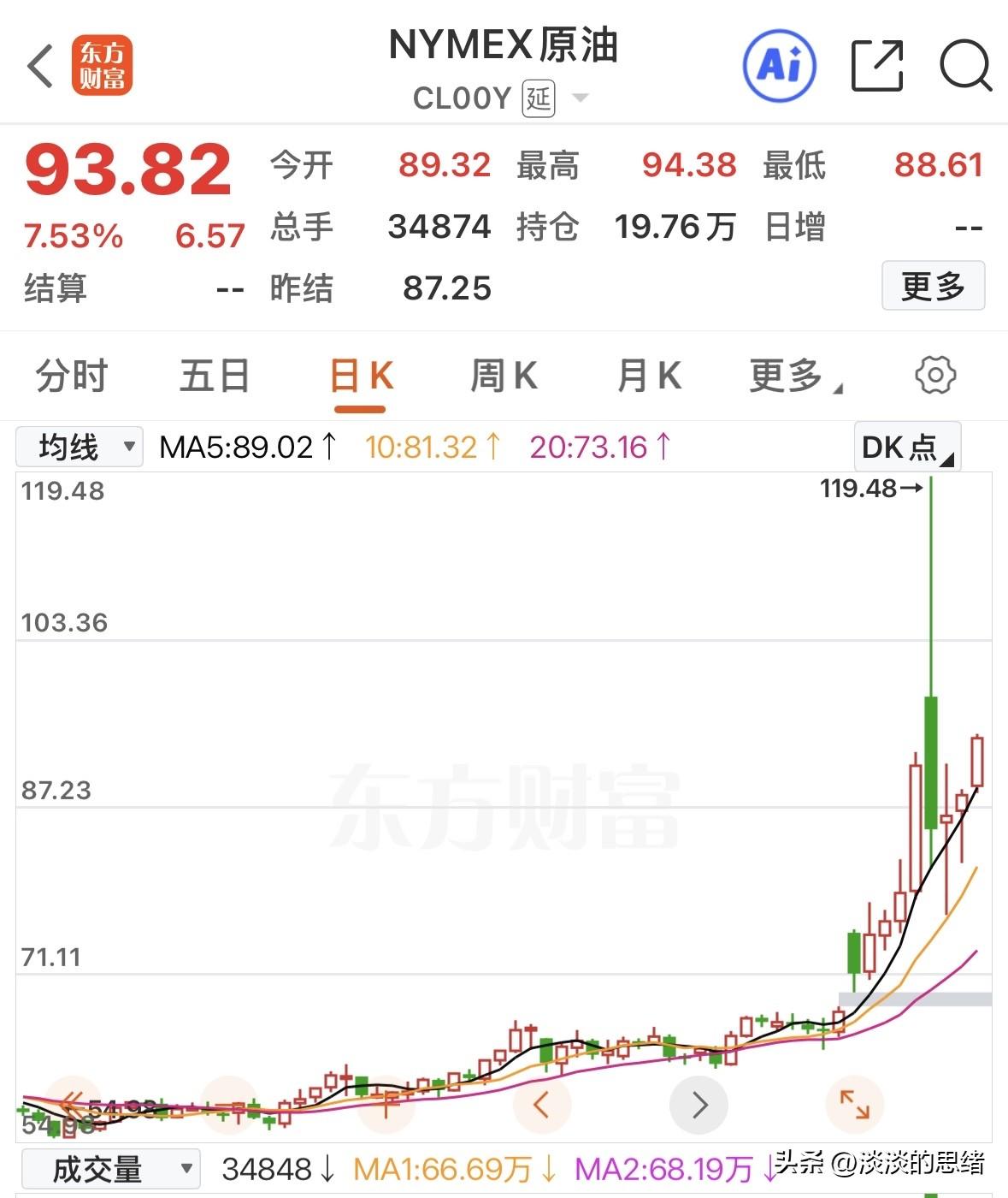 刚刚又大涨了!原油昨晚收盘大涨6%,今天开盘后又大涨超7%,原油大涨对股市形成利空,今天能源油气相关板块可能会高开高走,当然高开太多就是危险信号。 近期追石油股能源股的投资者不少被套住了,这个板块波动太大,而且板块亏损的公司太多,没有业绩支撑趁原油大涨的时候拉升后就套人。 昨晚欧美股市也进入调整状态,美股能源股油气股爆发,涨幅居前的板块大多是相关板块,今天A股这些板块也可能顺势高开。但前两天的走势已经给让了一课,所以要谨慎参与。 A股已经连续上涨三个交易日,昨天三大指数虽然收涨,但个股跌多涨少,今天原油继续大涨,可能有回调的风险,虽然趋势向上,但中东不确定性因素随时可能影响走向。 原油盘中还在拉升,此时国际原油站上了93美元/盎司。布伦特原油昨晚大涨6.64%,收报于93.63美元/盎司,此时还没有到开盘时间。