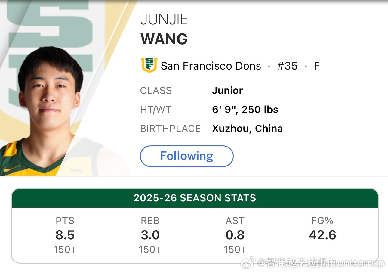 王俊杰大三赛季场均8.5分3板,追平王泉泽18-19赛季在宾夕法尼亚大学的单赛季场均得分纪录,两人并列成为NCAA一级联赛历史上单赛季场均得分最高的中国球员。紧随其后的马健老师93-94赛季在犹他大学的场均8.2分3.7板王俊杰NCAA中国男篮