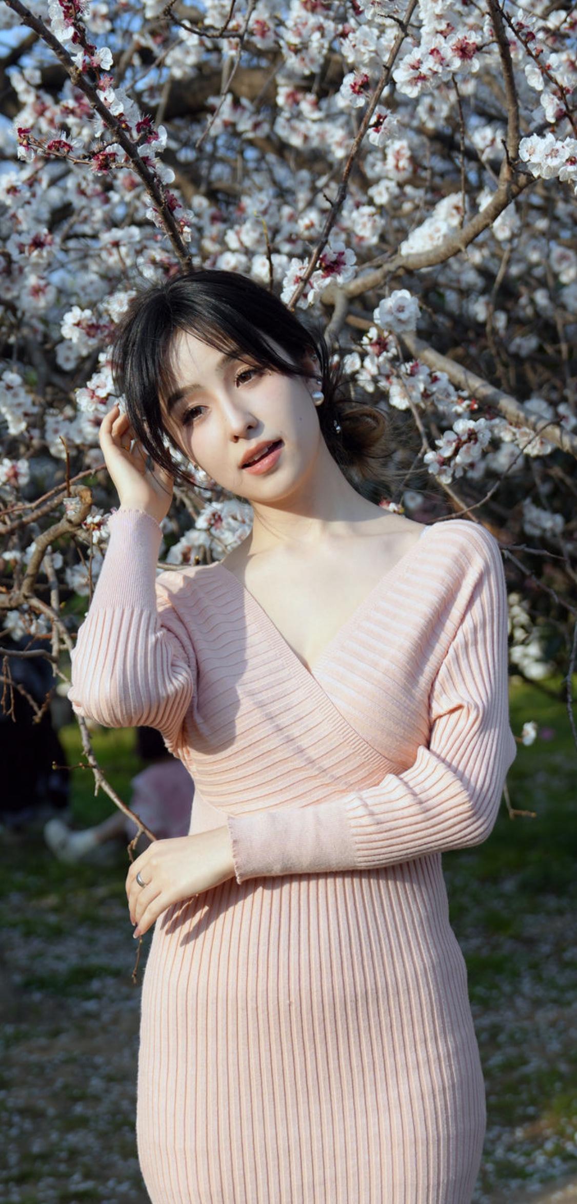 樱花树下,粉衣少女,春意盎然。