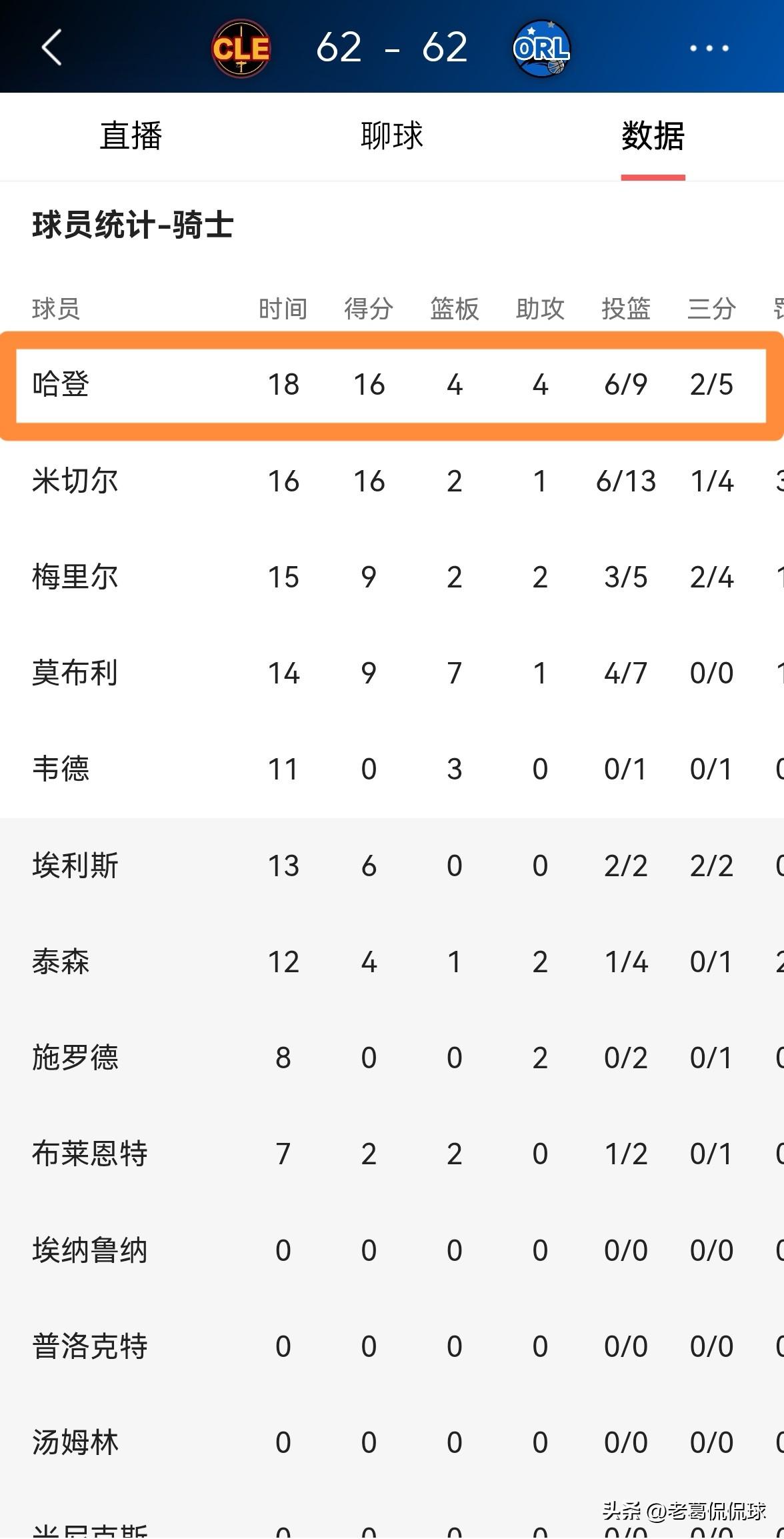我必须要好好夸夸骑士当家后卫哈登!在今天骑士客场挑战魔术的比赛中,目前双方半场战罢,骑士和魔术战成了62平。值得一提的是,在前两节比赛中,哈登将球队的进攻重担抗在肩上,他在首发出战的18分钟里,投篮9中6,其中三分球5中2、罚球2中2非常高效的砍下16分,外加4篮板4助攻。 老实说,如果哈登能够在下半场比赛中延续自己的出色状态,那么骑士将会必胜无疑,我期待着在比赛结束以后继续称赞哈登的表现。