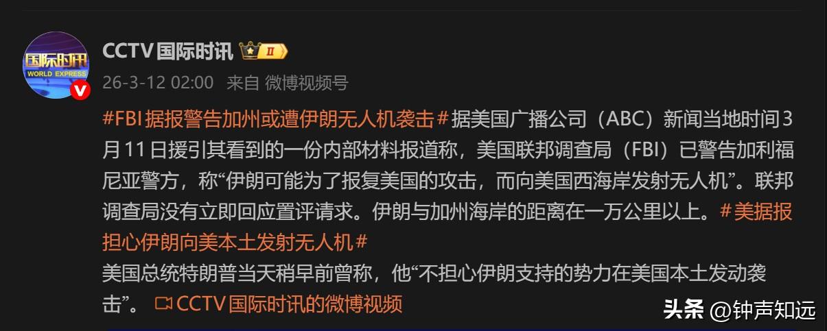 伊朗要袭击美国本土?新哈梅内伊果然更狠! 3月12日美媒爆料,FBI警告加州警方伊朗或从西海岸外海对加州发动无人机袭击,这也是美方首次披露伊朗或把无人机打击范围延伸至美国本土 。 此番预警恰逢伊朗新任最高领袖穆杰塔巴上任,其家人父亲、妻子、儿子在美以空袭中遇难,伊朗方面已明确表态会强硬反击,革命卫队更是宣称有能力开展六个月的高强度战争,还将启用新型远程导弹 。 目前FBI尚未掌握袭击的具体时间、目标等信息,仅为情景预警,特朗普也公开表示不担心伊朗相关势力袭击美国本土 。 但美军近期已对伊朗超5500个目标实施打击,伊朗则接连用导弹和无人机袭击中东美以设施,十余处美军事基地遭破坏 。 加州当下已加强海岸监控和关键设施防护,当地暂未发布民众避险指令,这场美伊对峙的火药味仍在持续升级。
