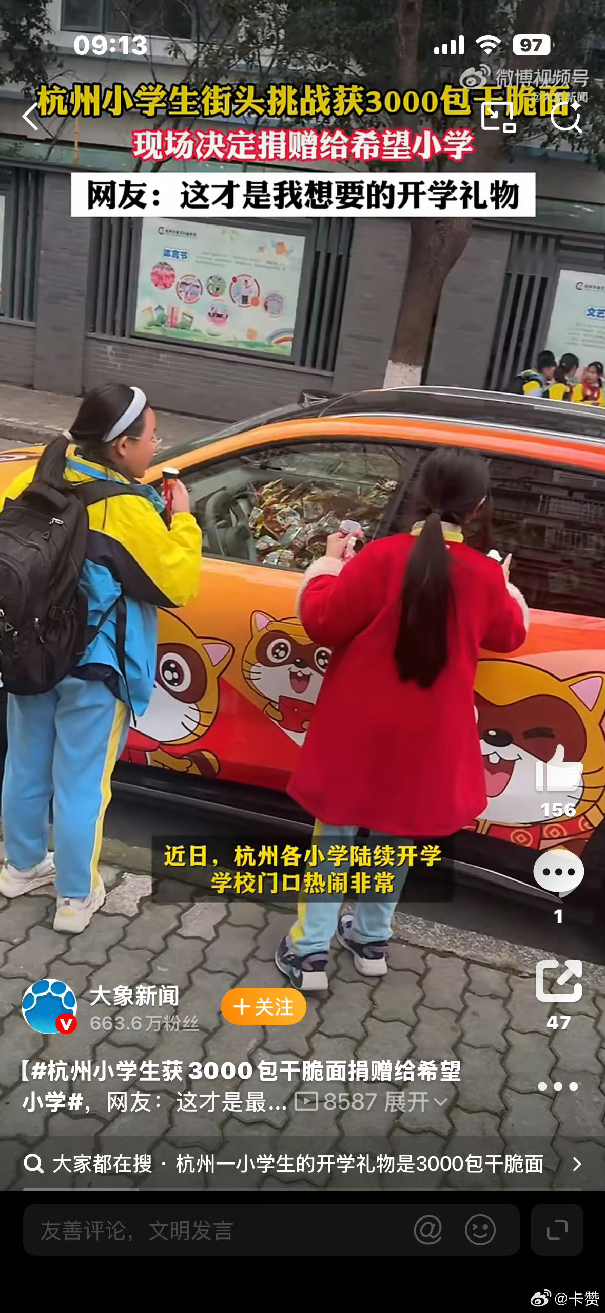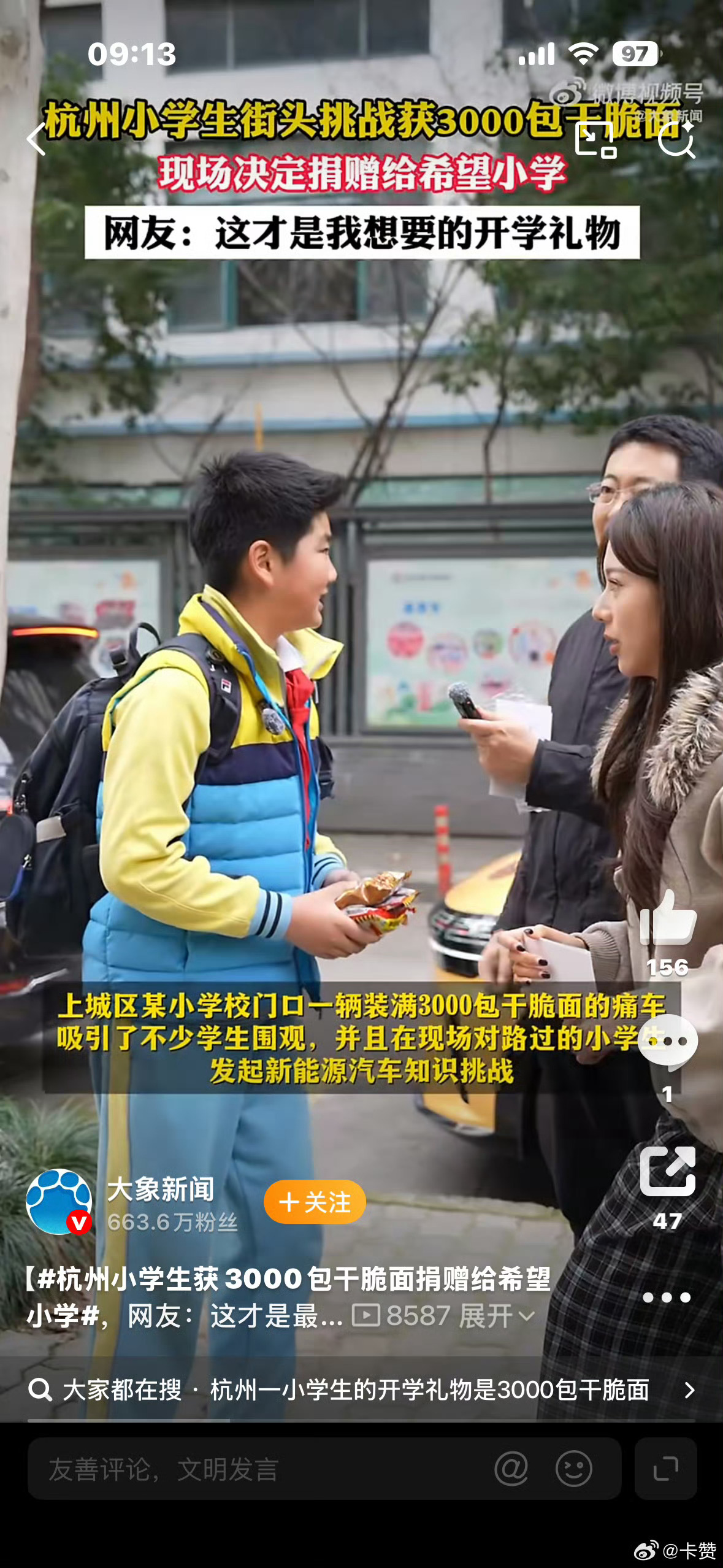 杭州小学生获3000包干脆面捐赠给希望小学不得不说这个小家伙真厉害!杭州的郑同学也太绝了,新能源汽车知识说得头头是道,赢了3000包干脆面还二话不说全捐给希望小学!