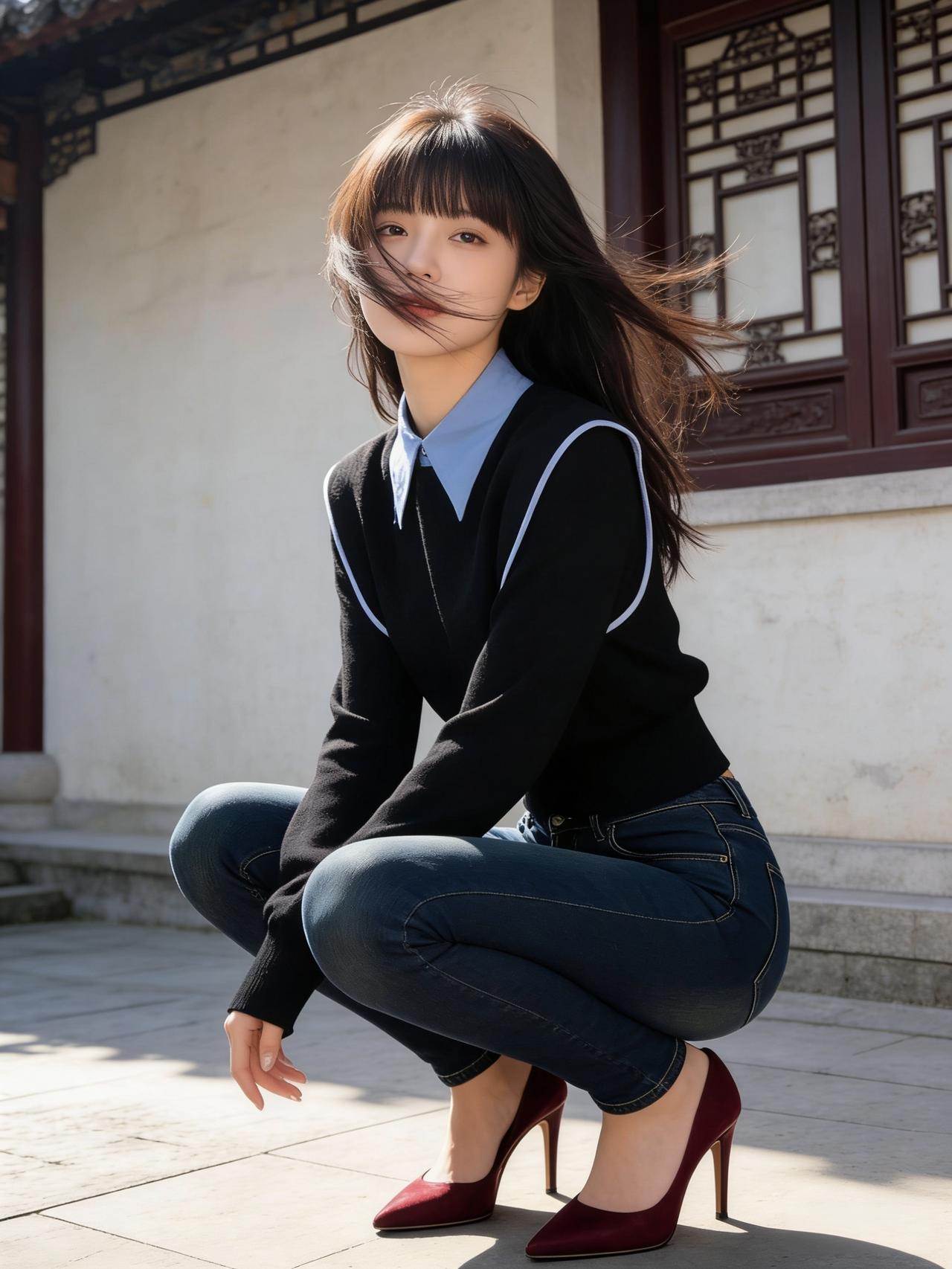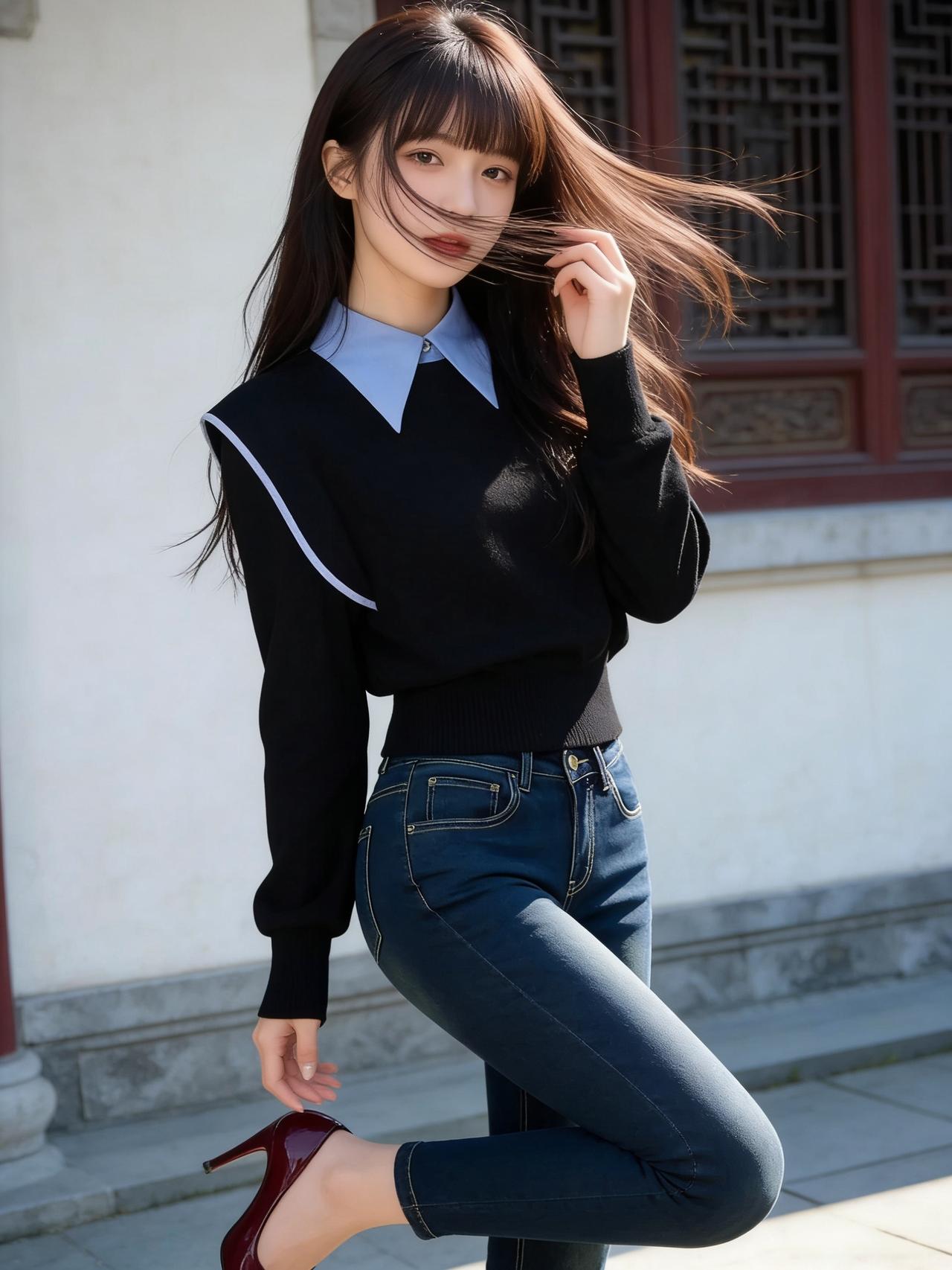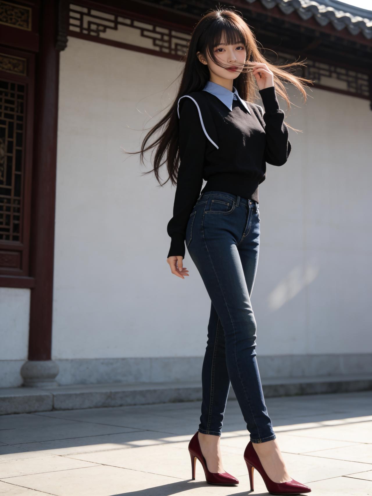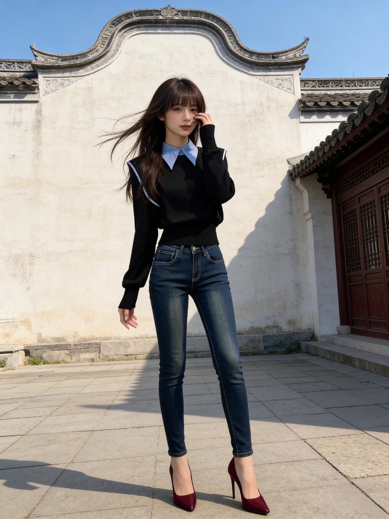 优雅的蓝色连体裤,配上红色高跟鞋,在古色古香的建筑前拍了照,感觉自己美美哒!蓝色