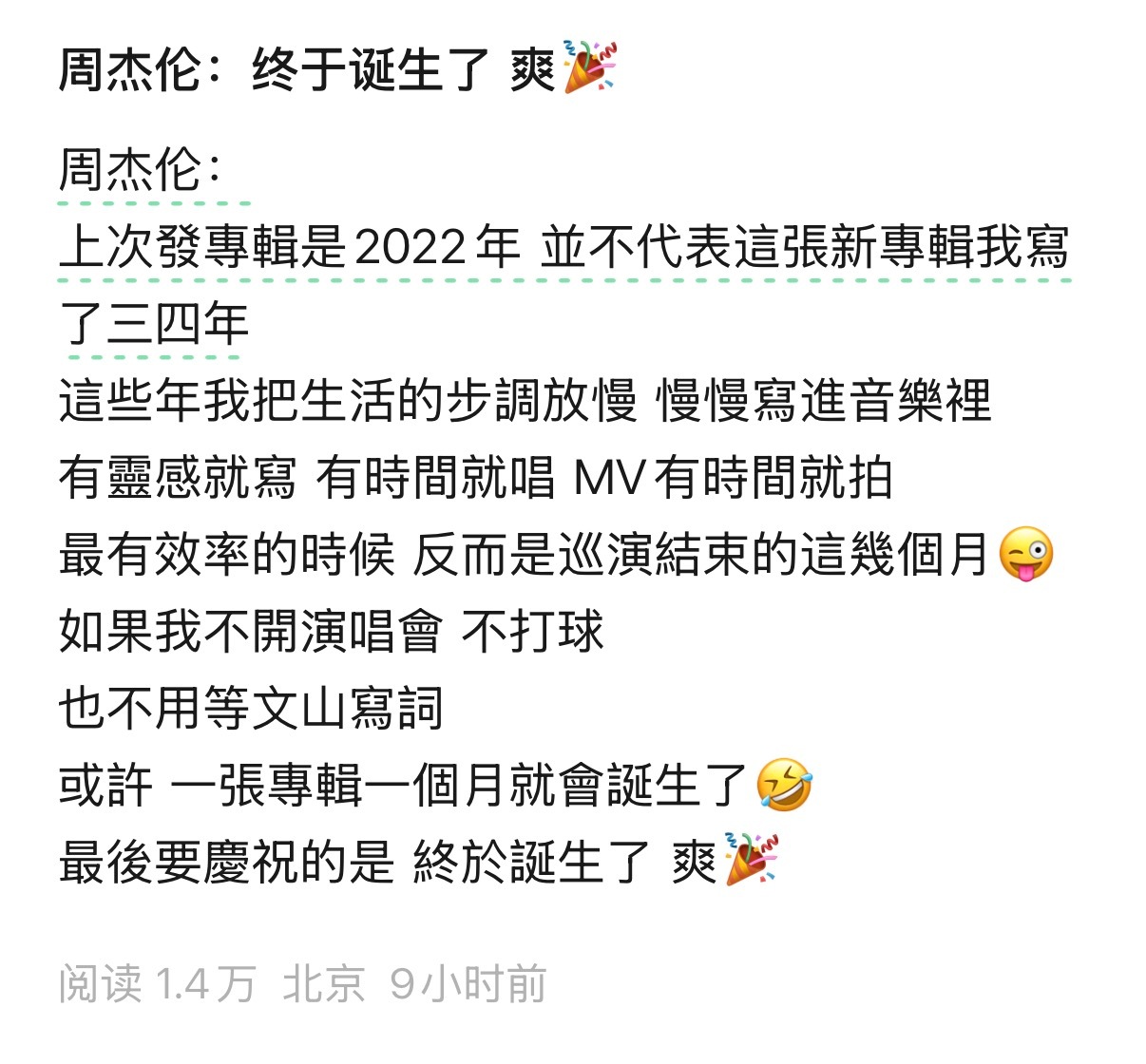 周杰伦说新专辑没写三四年哎哟,不错哦!又被你装到了,周董周杰伦说如果不开演唱會不打球,也不用等文山写词,或许一張专辑一個月就誕生了🤣