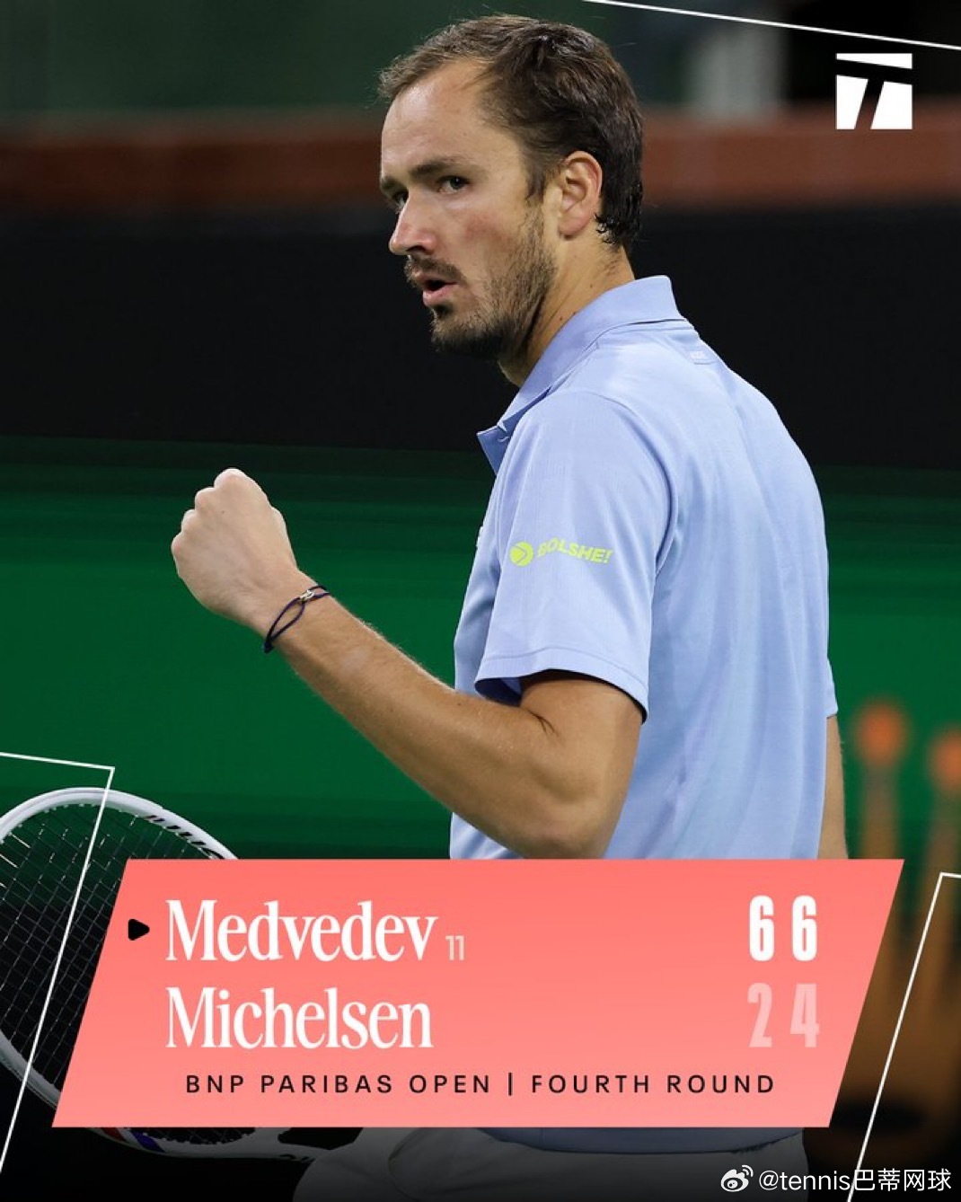 男子:🇪🇸阿尔卡拉斯6:1,7:6🇳🇴鲁德🇬🇧诺里6:4,6:2🇦🇺土方凛辉🇷🇺梅总6:2,6:4🇺🇸米克尔森