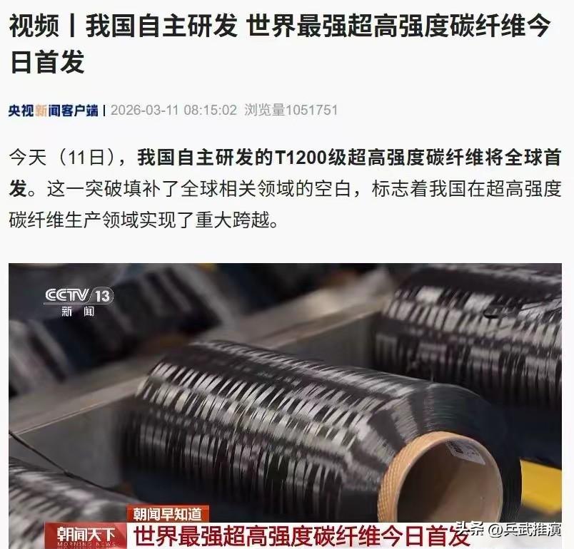 这可是真的遥遥领先全世界的咱中国自主研发! 咱们中国又造出好东西了,全球第一,真提气。 3月11日,我国自主研发的T1200级超高强度碳纤维全球首发。 这是咱们自己搞出来的技术,没有依赖外国。 这款材料比国外的T1100更细、更硬。 它很轻,但是强度很高,能用在航空航天和高端装备上。 以前这项技术被外国卡住,我们买不到、也学不来。 现在我们自己突破,还能大规模生产。 有网友说,这填补了世界空白,咱们国家在这个领域走到了最前面。 中国爱好和平,研发新技术是为了发展建设。 有了这样的硬核技术,谁也卡不住我们的脖子。 笔者认为,科技越来越强,国家越来越稳,老百姓心里更踏实。 为中国科研点赞,为祖国自豪,真爽。 对此,你怎么看呢?