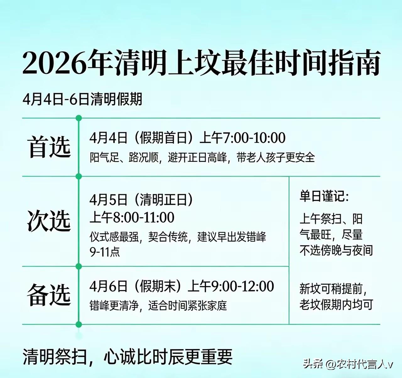 2026年清明不一般,上坟扫墓避开这4天,哪4天?老传统要记牢。 清明将至,2026年的清明节有点特殊。老祖宗留下的规矩里,有4天千万不能去扫墓,否则可能触霉头、坏运气。到底是哪4天?背后又有什么讲究?这篇文章一次说清,赶紧收藏转发,别让家人朋友“踩坑”。 清明节,是咱们中国人最重要的祭祖节日之一。 扫墓、祭拜、献花、烧纸……这些传统习俗,承载着对先人的思念,也寄托着对未来的祈福。 但你知道吗?2026年的清明节,有点不一般。 老祖宗留下的规矩里,有4天是“忌日”,扫墓上坟千万别选这4天,否则可能适得其反,甚至惹来不必要的麻烦。 今天,咱们就掰开揉碎,聊聊这4天到底是哪几天,背后的讲究又是什么。 第一忌:清明当天,别急着“抢头香”! 很多人觉得,清明节当天去扫墓,才是对先人最大的尊重。 但老传统里,清明当天其实不是“最佳扫墓日”。 为啥?因为清明节是“节气”和“节日”的重合,这一天阳气最盛,阴气最弱,而扫墓本身是“阴事”,讲究的是“阴阳平衡”。 如果清明当天去扫墓,容易“阳气冲撞阴气”,反而对先人不敬,也容易让自己运势受影响。 更关键的是,2026年的清明节,正好是“戊日”。 在传统黄历里,“戊日”是“土神值日”,这一天动土、扫墓、修坟,都被认为会“冲撞土神”,导致家宅不安、事业受阻。 所以,2026年清明当天,尽量别去扫墓,换个日子更稳妥。 第二忌:农历三月初三,避开“鬼节”冲突。 2026年的清明节是4月5日,而农历三月初三,正好是4月19日。 这一天,在民间被称为“上巳节”,也叫“鬼节”。 虽然不如七月半、清明节那么出名,但老一辈人都很忌讳这一天和扫墓“撞车”。 为啥?因为“上巳节”是“鬼门关大开”的日子,阴气极重,而扫墓也是“接触阴气”的活动。 如果这两天赶在一起,容易让“阴气过盛”,导致家人身体不适、运势低迷,甚至招来不必要的“麻烦”。 所以,2026年扫墓,尽量避开农历三月初三(4月19日),前后错开几天更安全。 第三忌:清明前后的“重丧日”,千万别碰。 “重丧日”,是老黄历里最忌讳的日子之一。 简单来说,就是“重复办丧事”的日子,如果在这天扫墓、修坟,容易被认为会“招来新的丧事”,对家族运势极其不利。 2026年的清明节前后,有几个“重丧日”要特别注意: 农历三月初六(4月22日):这一天是“月忌日”,老传统认为不宜动土、扫墓。 农历三月初五(4月21日):这一天是“破日”,黄历里写“诸事不宜”,扫墓更是大忌。 如果家里有老人、小孩,或者最近运势不太顺,这2天千万别去扫墓,否则容易“雪上加霜”。 第四忌:清明后的“杨公忌日”,百事不宜。 “杨公忌日”,是风水学里最凶的日子之一。 传说杨公有13个儿子,但因为他在“杨公忌日”这天说了大话,结果13个儿子陆续去世,从此“杨公忌日”就成了“百事不宜”的凶日。 2026年的清明节后,有一个“杨公忌日”要避开: 农历三月初七(4月23日):这一天是“杨公十三忌”之一,扫墓、修坟、动土,都被认为会“触霉头”,导致家宅不宁、事业受阻。 如果实在想清明后扫墓,尽量避开这一天,前后错开3天更稳妥。 2026年清明,什么时候扫墓最好? 既然这4天不能扫墓,那什么时候去最合适? 老传统里,清明前10天到后5天,都是“扫墓吉日”,但最好避开上面说的4天。 如果实在拿不准,可以选清明前3天(4月2日-4日)或清明后3天(4月6日-8日),这几天阳气渐盛,阴气渐弱,扫墓更安全、更吉祥。 另外,扫墓时还有一些小讲究: 尽量选上午,阳气最足,别拖到下午3点后。 穿素色衣服,别穿大红大绿,对先人不敬。 扫墓时别吵架、别说晦气话,保持敬畏之心。 最后说一句:传统不是迷信,是敬畏! 清明扫墓,扫的是对先人的思念,祭的是对未来的祈福。 老传统里的这些讲究,不是迷信,而是对“阴阳平衡”“天时地利”的敬畏。 2026年的清明节有点特殊,避开这4天,选个吉日去扫墓,既是对先人的尊重,也是对自己的保护。 赶紧把这篇文章转发给家人朋友,别让孝心“踩了雷”。 清明将至,愿先人安息,后人平安!上坟常识 清明上坟风俗 清明祭扫禁忌 扫墓误区 扫墓方法 清明上坟禁忌 扫墓健康禁忌
