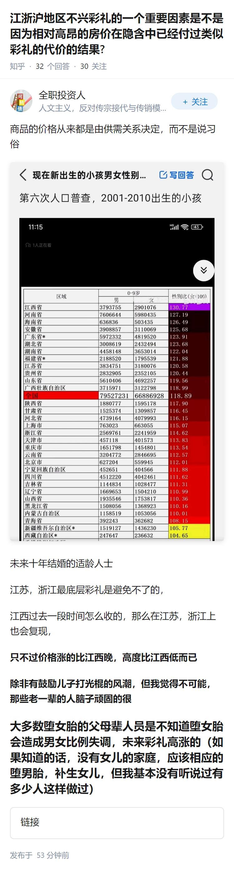 江浙沪地区不兴彩礼的一个重要因素是不是因为相对高昂的房价在隐含中已经付过类似彩礼的代价的结果?