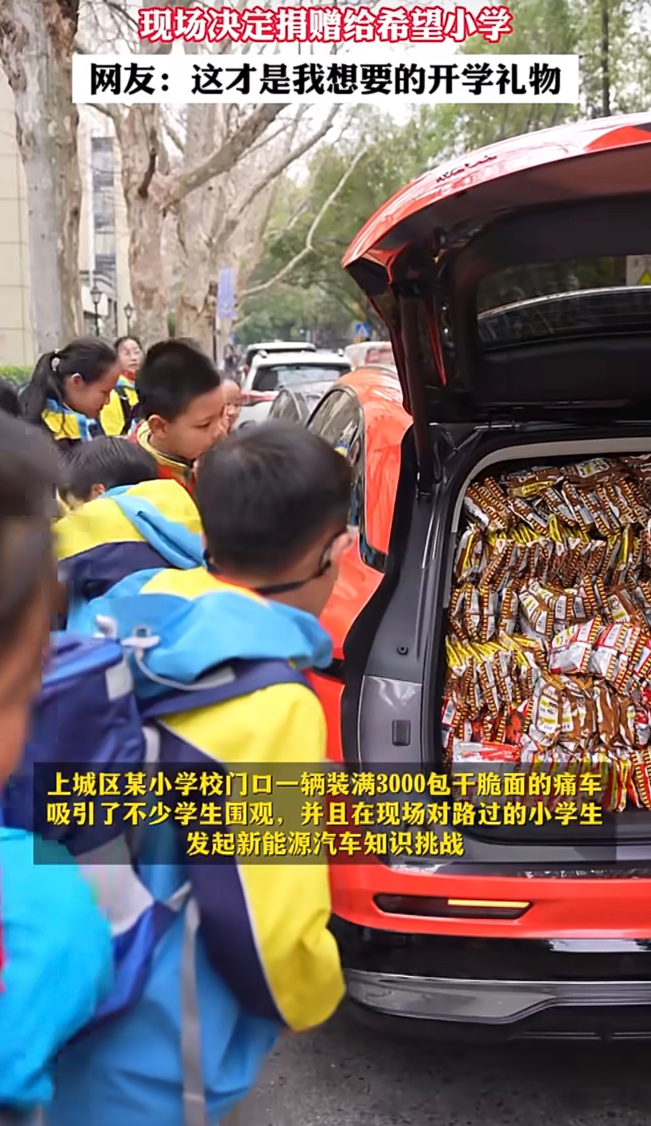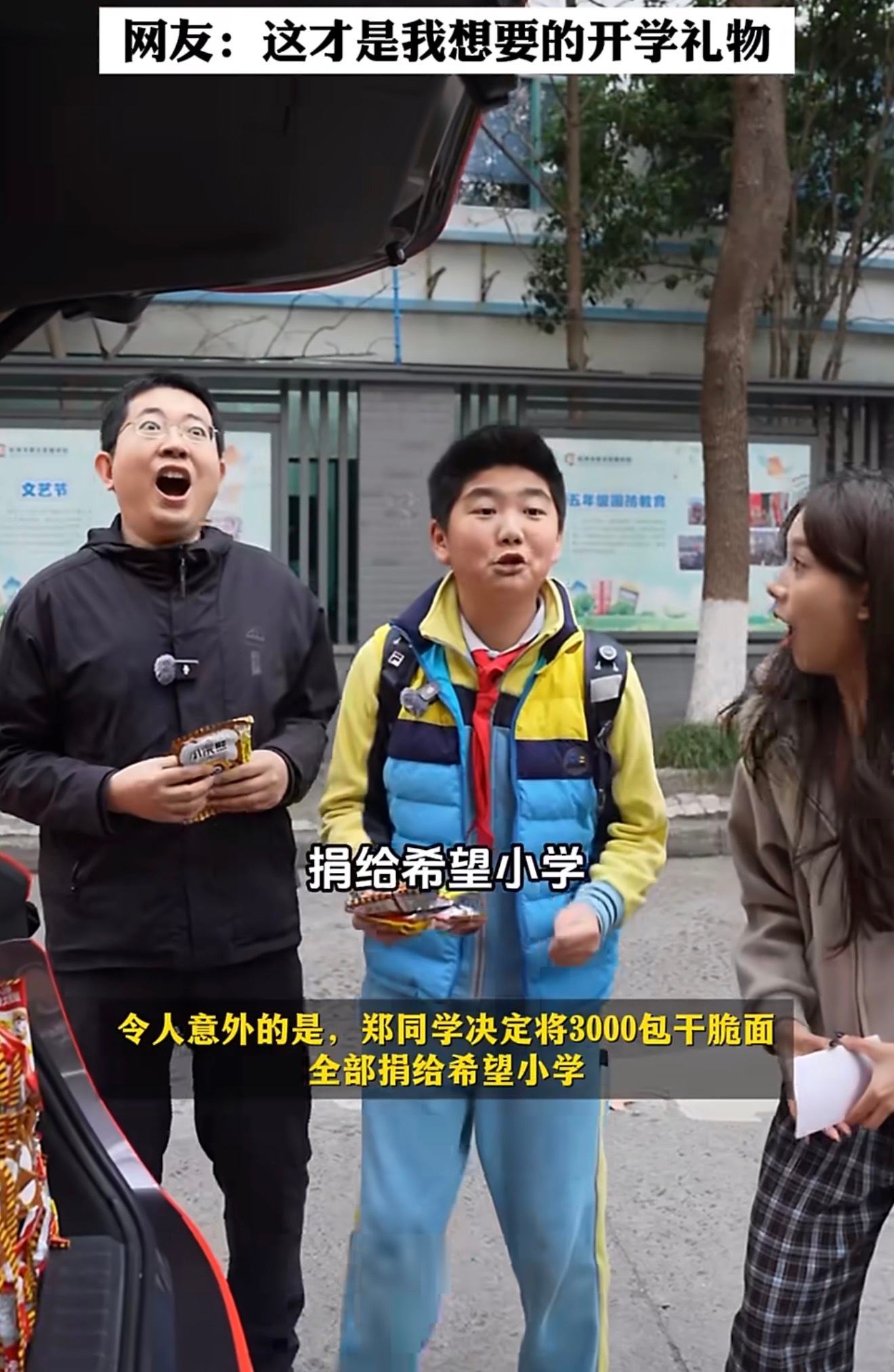 杭州小学生获3000包干脆面捐赠给希望小学还有格局的小郑同学,自己凭实力赢了3000包干脆面,结果没有独享都分享了,很有格局的孩子,我们那时候开学礼物全是学习资料,一整个羡慕了🥹
