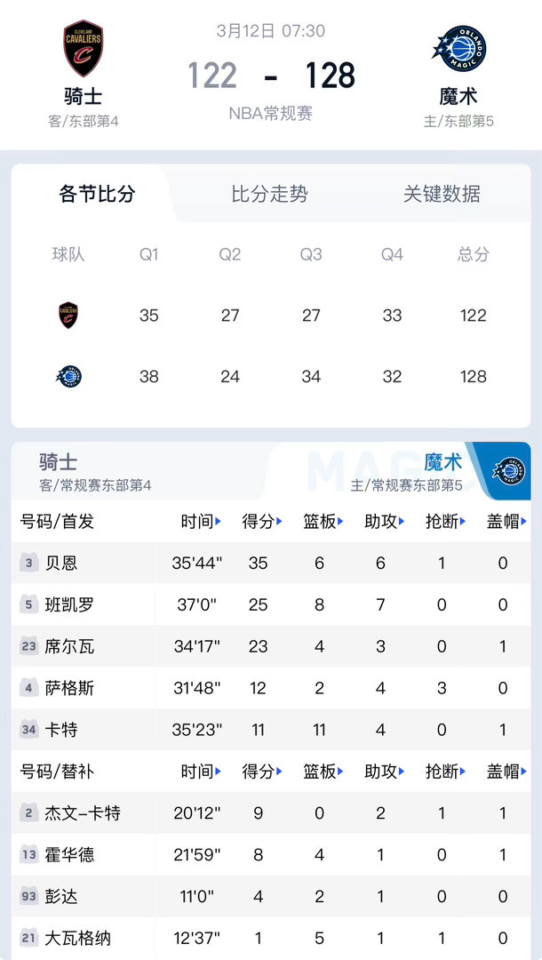 骑士追至2分,生死时刻贝恩底角三分一箭穿心,35分硬解带走比赛,魔术五连胜直冲东部前列。哈登30分创生涯新高仍空砍,骑士外线守不住、内线顶不动,问题全暴露。贝恩大心脏三分魔术战胜骑士