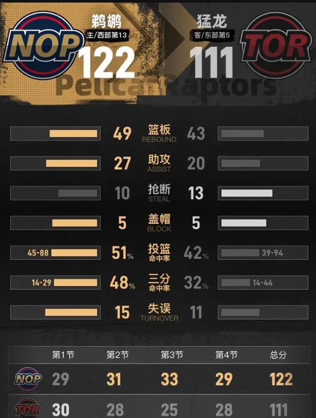 别看猛龙三人轰了63分,这球输得真不冤。球星单打在现代篮球面前,就像拿刀砍坦克。 胖虎只拿19分,鹈鹕却赢球了。靠的是啥?墨菲三分10中6轰28分,默里27分6助攻。第三节拉开分差那几分钟,墨菲连扔三记三分直接打停猛龙,默里中距离稳得像训练。我看得直喊:这才是团队篮球啊!反观猛龙,英格拉姆第三节被琼斯贴死后,全队直接断电——球在谁手里谁打,纯粹盲人摸象。 防守更辣眼睛。鹈鹕三分37中18,命中率快五成,猛龙外线扑防总慢一步。墨菲和琼斯多少个大空位?全是换防沟通失误白送的。替补席更是灾难,16比30被爆成渣。鹈鹕那边费尔斯、米西上来就玩命冲板,第四节初那段分差就是替补硬扛出来的。 最扎心的是第四节追到差8分。英格拉姆强投打铁,巴雷特突破被胖虎正面血帽。生死时刻还在赌单打,战术?不存在的。默里和胖虎挡拆,能投能传,猛龙根本不敢包夹。墨菲防守端追着英格拉姆跑,进攻端接球就投,这才是3D升级版的价值。 猛龙这阵容像五星级饭店摆路边摊——听着唬人,吃起来没味。堆了四个能持球的,关键时刻球权却分不明白。鹈鹕赢在化学反应清晰:内线硬凿吸引包夹,外线拉开等三分机会,替补玩命防守。 这哪是球星打败了球星,分明是体系打败了英雄球。放下对球星的执念,拥抱团队,这才是治愈系赢球的真相。墨菲三世28分奎克利25分 鹈鹕胜猛龙