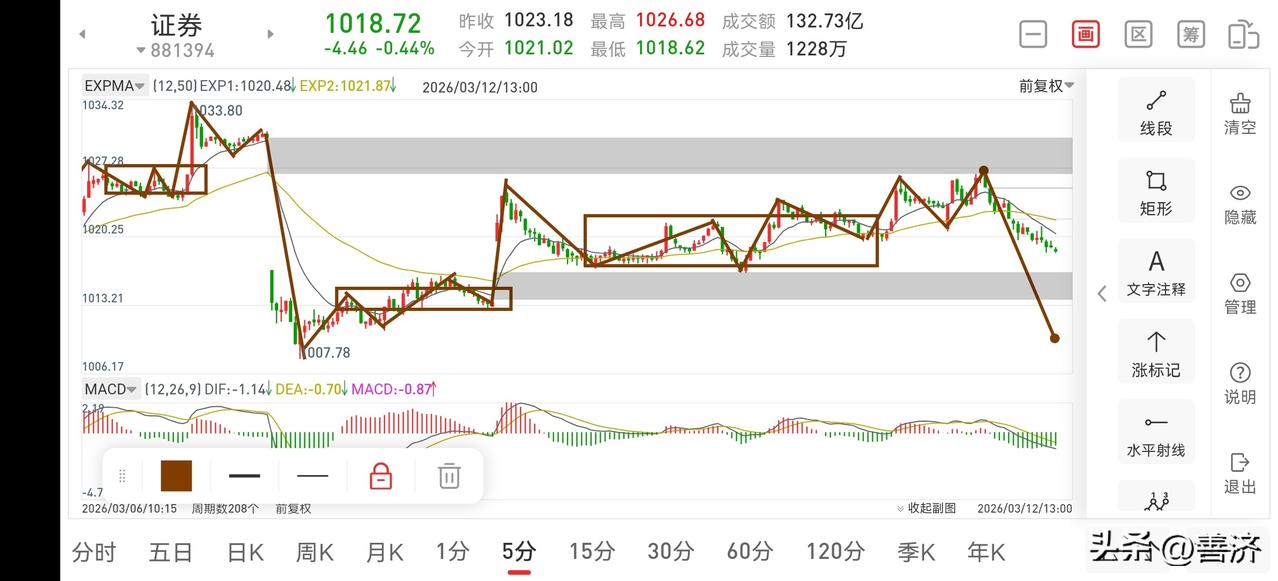 聊聊证券板块(2026.3.12) 今天证券板块早盘虽然有一个上升动作,但目前并不具备上攻条件,在昨晚的文章中讲过,今天会是一个回落的过程,那么下午继续看回落,但回落是正常可控的,此处无需忧虑,机会仍然远大于风险,是值得博弈的。 1.从30分钟图一上看,下午有继续回落的技术需求,这是30分钟上第8笔的回落,可能会有点力度,技术上看,会回落至前底附近,但不会去创新低。 2.从5分钟图二上看,目前构建了9笔5分钟的中枢,第9笔下挫力度会比较强,除了会回补下方缺口外,预计还会击穿下方5分钟中枢下沿,所以昨晚文章中就讲过,想做高抛低吸的今天开盘就可考虑减仓三成,等击穿5分钟中枢下沿后再考虑回补仓位,我是不高兴去高抛低吸了,毕竟空间也不大。 总之,此处主力就是一个不断吸筹建仓的过程,过程会比较缓慢,但在慢牛前提下,只能耐心持股待涨。天南地北大拜年 证券板块解析