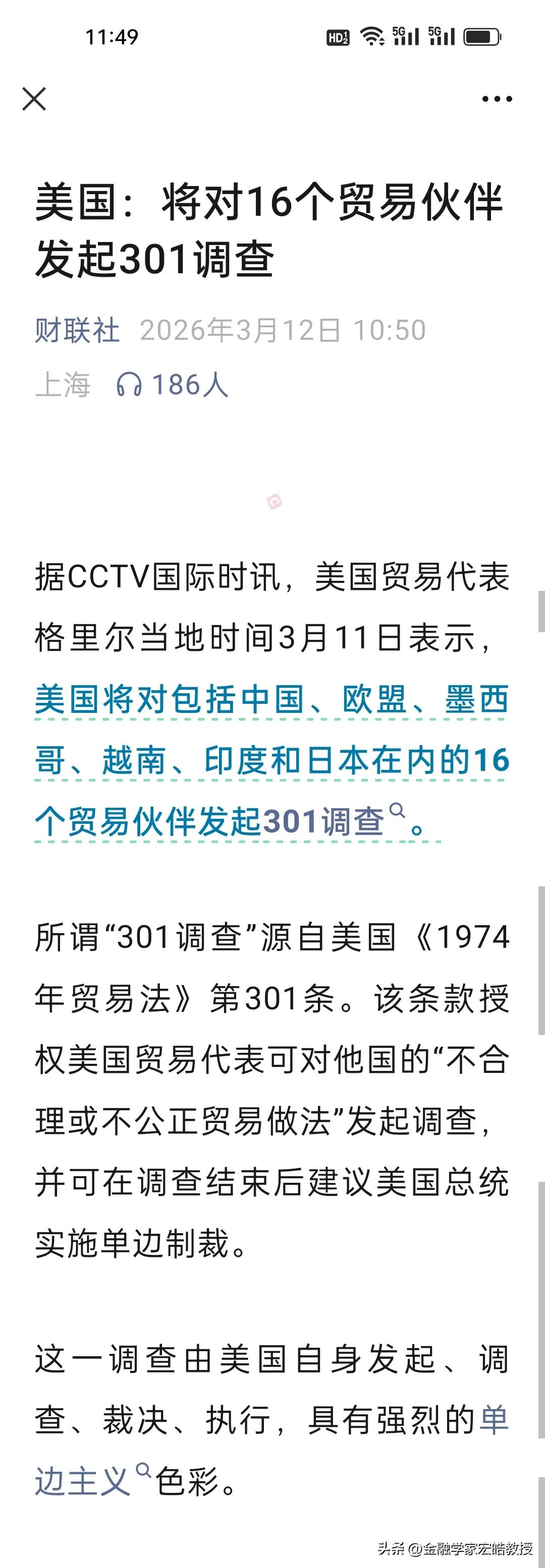 突发消息!特朗普这边刚刚说跟中国关系好,很快就要访华,今天美国对中国发起了第7次301调查,这是关税要再加码? 美国贸易代表刚宣布,对包括中国、欧盟、日本在内的16个经济体发起301调查,这已是第7次针对中国的单边贸易调查。而且美国所谓的“盟友”都在调查范围之内,在特朗普眼里,盟友都是占尽美国便宜的,既然占了便宜,肯定就要还回来。 当前美国对中国加征的关税仍维持在25%(针对约3000亿美元中国商品),而301调查的最终结果,大概率会推动关税进一步上调,甚至可能覆盖更多品类。 更讽刺的是,特朗普昨天还刚刚放风“计划访华”释放缓和信号,这会又急着挥起贸易大棒,本质是以打促谈:用极限施压为自己捞取政治筹码,既讨好国内蓝领选民,又想逼迫中国在贸易、科技等领域做出让步。 这套“自己调查、自己裁决”的单边主义,早已被证明是双输游戏——美国消费者要为更高物价买单,全球供应链也将再次被撕裂。
