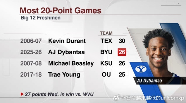 AJ Dybantsa本赛季得分20+比赛已来到26场,Big12联盟历史上菜鸟新人20+场次仅次于杜兰特NCAANBA