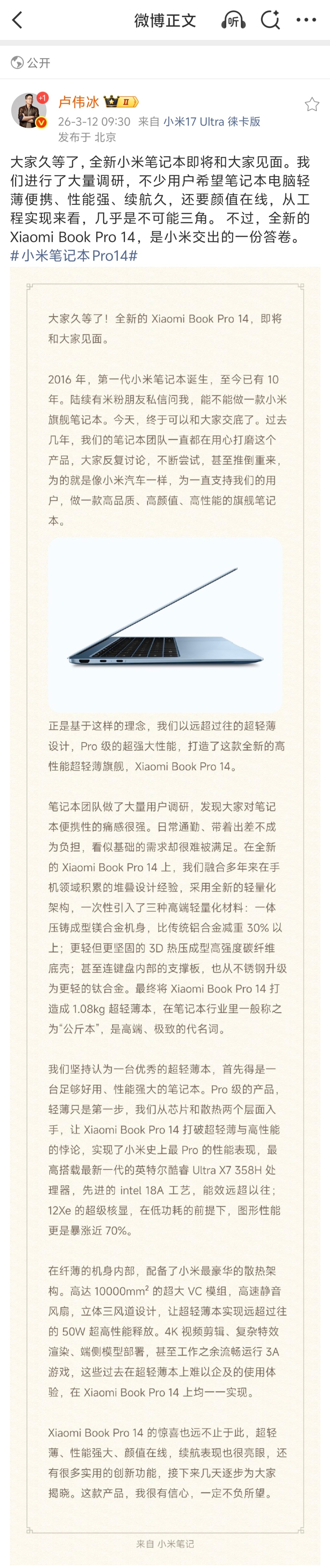 来了来了,卢伟冰官宣小米笔记本新品即将发布 全新的小米笔记本Pro14,直接上了最新一代英特尔酷睿Ultra X7 358H处理器,核显甚至干到了3050ti的水平!