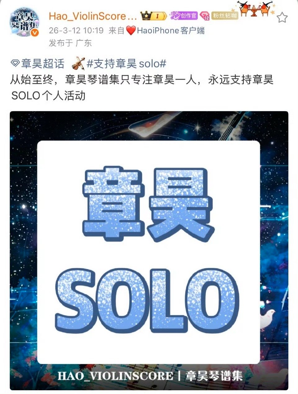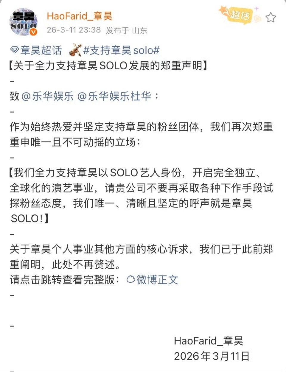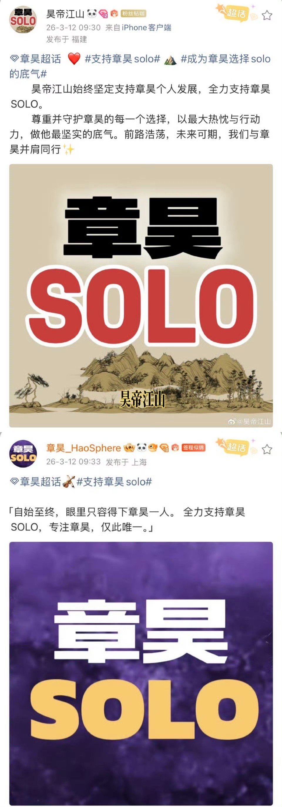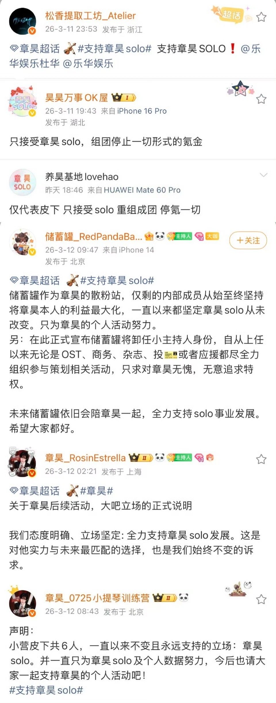 章昊粉丝站子发声;坚定支持章昊solo发展,不接受任何形式组团