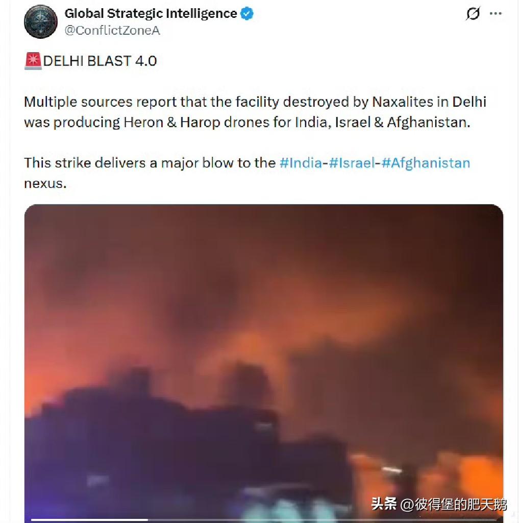 #伊总统提出结束战争3大必要条件# 在波斯湾地区侵略与反侵略战争热火朝天之际, 印度最正义武装组织发扬国际主义反帝反霸反侵略精神,炸毁了德里为侵略者生产武器的工厂。 多个消息来源报道(当然是巴基斯坦为主),毛派武装在德里摧毁的设施当时正在为印度、以色列生产 “苍鹭” 和 “哈洛普” 无人机。 这次袭击对印度-以色列联盟造成了沉重打击。 #伊朗寻获一枚1吨重未爆炸导弹##分析称美国可能真的有点撑不住了#