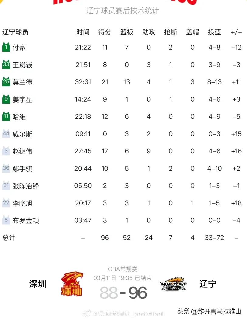 辽宁队比赛打的轻松与否和内线发挥有直接关系,你可以去看看辽宁队输球一般都是莫兰德比赛态度懈怠漫不经心,付豪防守拉胯,进攻没有手感。而辽宁队赢球一般都是球队莫兰德要么篮板爆了,要么得分上双,付豪不拖后腿就能拿下比赛。 昨晚辽宁队有20个失误都没有输球,别忘了对手可是深圳队,联赛的黑马,之前辽宁队已经被双杀了,可是就这么多的失误还是把比赛拿下了,一看数据莫兰德21分13篮板4助攻,能投三分还能抢篮板球,这数据非常全面。付豪也拿到11分7篮板,表现不算太差,有他俩在内线表现让辽宁队不会太吃亏。 所以辽宁队内线要是发挥的比赛一般都能拿下,即使输球也是小负而已。莫兰德的态度 付豪的手感就是辽宁队输赢的晴雨表。