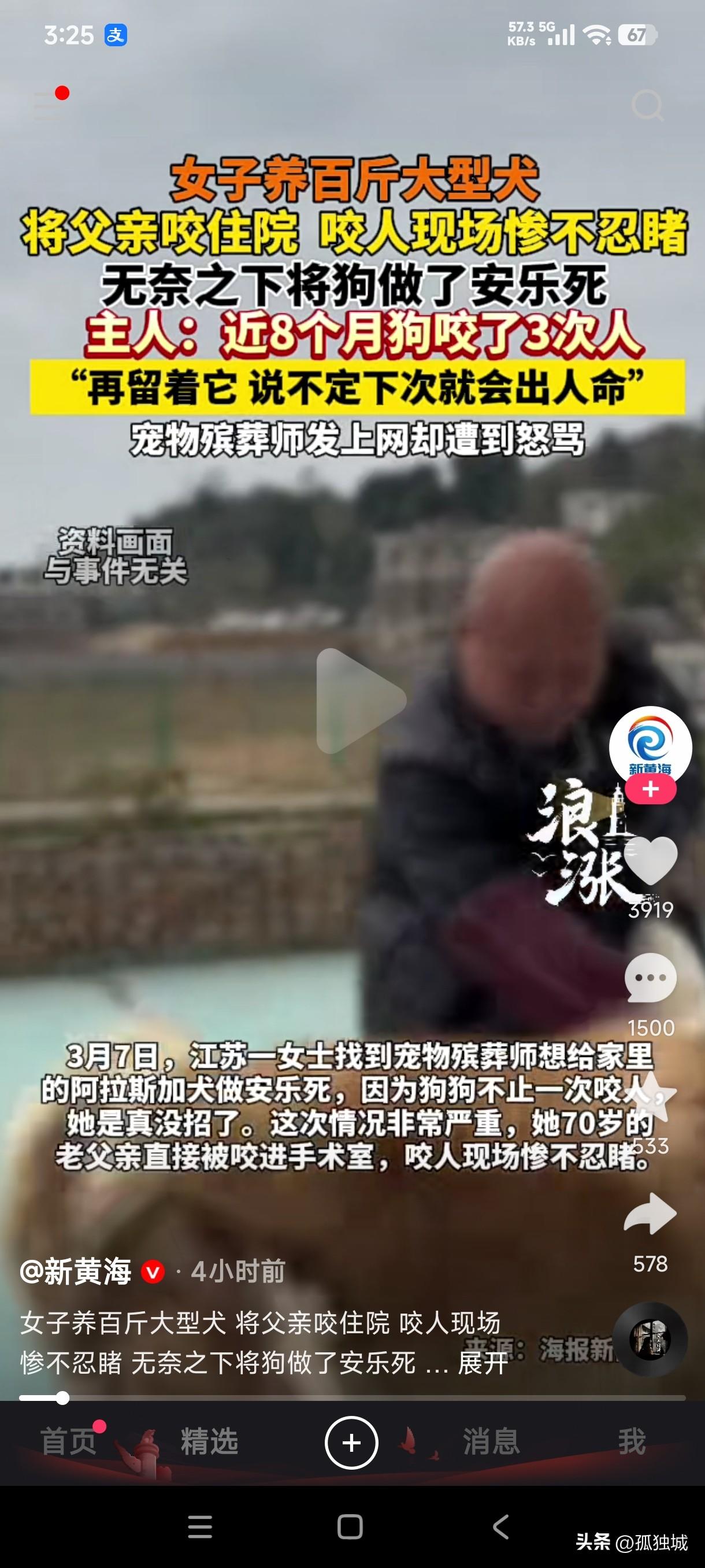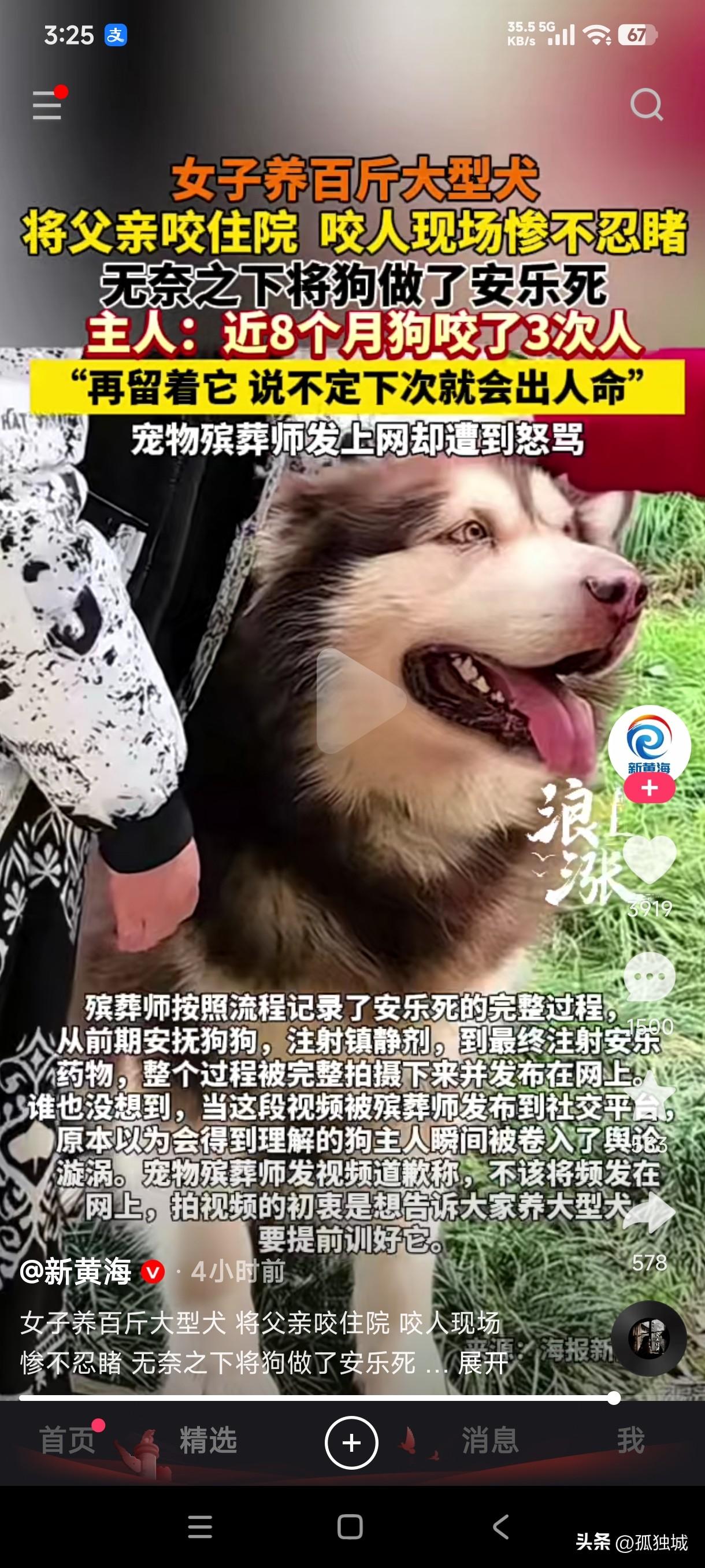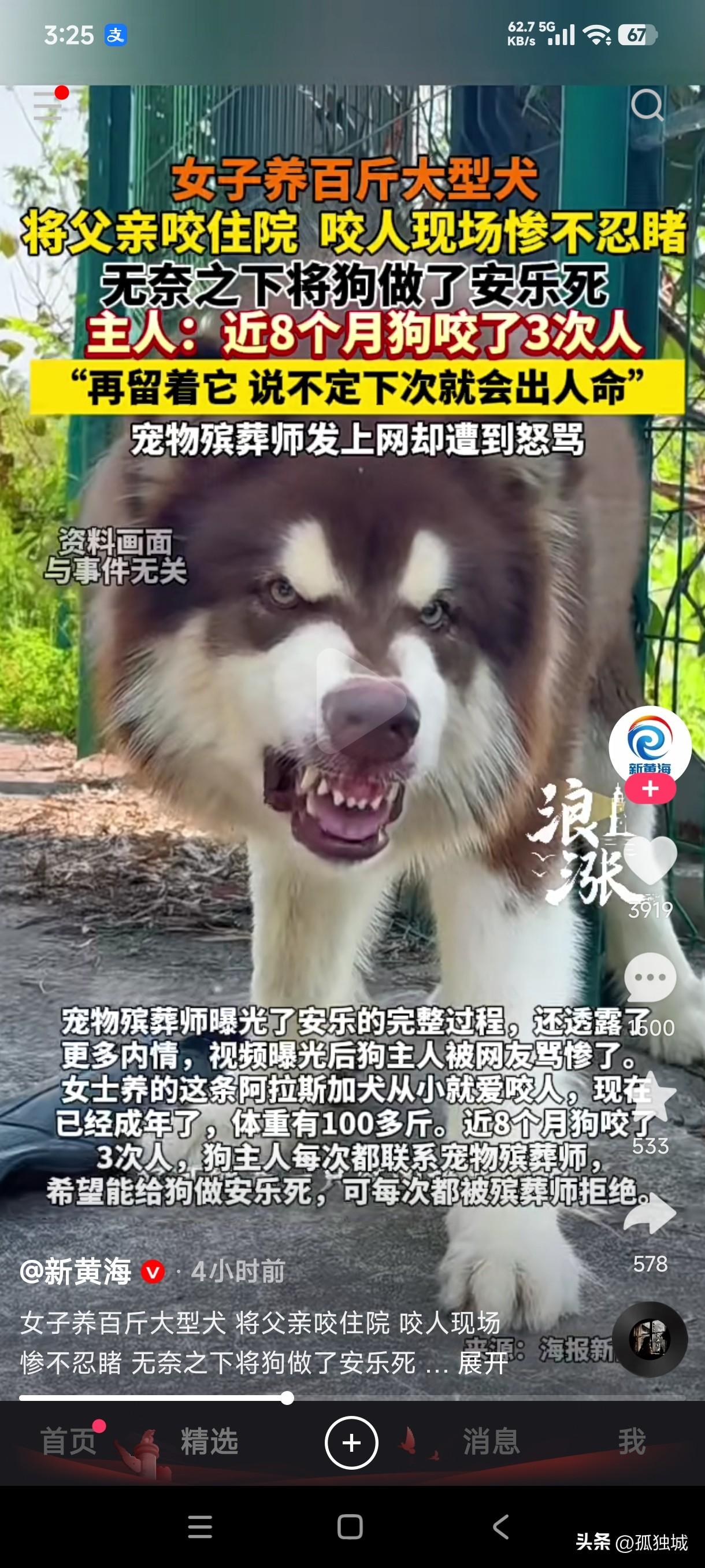 江苏一女子养百斤大型犬,将70多岁父亲咬进手术室,咬人现场惨不忍睹,女子无奈之下找宠物殡葬师将狗做了安乐死。 俗话说没有金刚钻就别揽瓷器活,对于这种体型巨大的狗子如果没有本事训练它,那就彻底断了养它的念头,这种名为阿拉斯加犬也不是善茬,并且它体型巨大,一般人狗主人根本就驾驭不了这玩意,有可能把狗没养熟还把自己给咬了不是吗。 这女子不就是例子吗?她养的这条阿拉斯加犬已经100多斤了,并且在8个月时间咬了3次人,第三次把自己的父亲咬的最严重,直接进了手术室,女子无奈之下多次找宠物殡葬师 要求给狗做安乐死,宠物殡葬师多次拒绝后最后还是答应了女子的要求,给这条狗做了安乐死,并且把狗安乐死的全部过程都拍了视频发到了网上,没想到遭到爱狗人士的辱骂,宠物殡葬师本以他把这条视频发到网上是让更多养狗人士引以为戒,没想到却卷入了舆论的漩涡,就连给狗要求做安乐死的这女子也不例外,也少不了被辱骂,随后宠物殡葬师又是发视频道歉。 大型犬多次咬人伤人,难道就不应该处理掉吗?养着它还会继续咬人,给它安乐死又遭到爱狗人士的谴责,不知道这种咬人的狗到底如何处理才好?