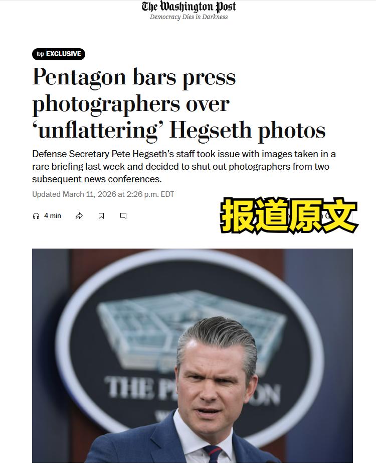 嫌弃拍得太难看,美国五角大楼禁止摄影记者进入发布会拍照。 美国的战争部门五角大楼,因赫格塞斯照片“不雅”而禁止摄影记者入内。只有五角大楼的专属摄影师才可入内拍摄。 美国战争部一把手赫格塞斯明显不开心,他对上周一次新闻发布会上拍摄他的照片提出异议,并决定禁止摄影记者参加以后的新闻发布会。说白了,把自己拍丑了“有损形象”。 那么到底是什么照片令其反应剧烈?目前尚不清楚。搞不好是每一张他的照片,他都不满意呢。